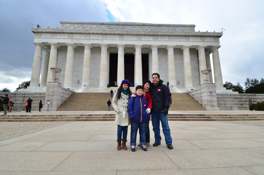 Kami lalu menuju Lincoln memorial yang berjarak sekitar 1 km dari Jefferson Memorial. Jika dilihat di peta Washington DC, Lincoln memorial berada satu garis lurus dengan Washington Monument dan Capitol House. Lincoln Memorial dibuat untung mengenang presiden Abraham Lincoln. Gedung yang selesai dibangun tahun 1922 ini di dalamnya terdapat patung besar Abraham Lincoln duduk di kursi. di sayap kiri dan kanan memorial terdapat ruang pameran sejarah Amerika dan Abraham Lincoln. Di halaman depan Lincoln Memorial terdapat kolam panjang, reflection pool, sementara di sisi kiri Lincoln memorial terdapat dinding marmer yang bertuliskan nama-nama tentara Amerika yang tewas di perang Korea. Saat kami di halaman Lincoln Memorial ini sempat turun hujan salju ringan.