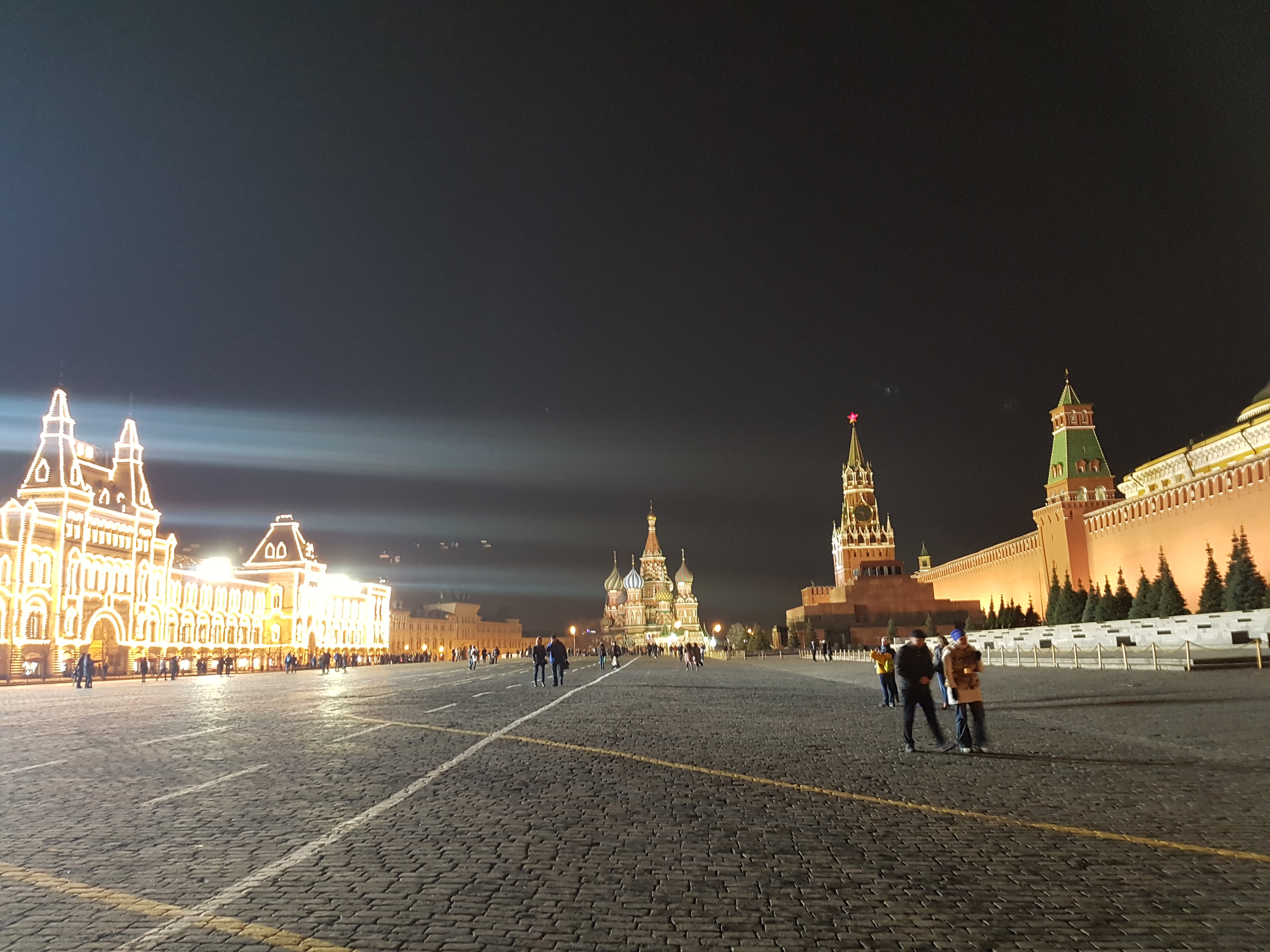 Cantik sekali suasana lapangan merah di malam hari. Suhu udara 1 derajat celcius tak menjadi halangan bagi banyak wisatawan yang menjelajahi berbagai sudut lapangan merah. Obyek yang paling banyak di datangi wisatawan untuk mengambil foto adalah St. Basil Cathedral. Gereja orthodox ini merupakan salah satu landmark paling terkenal di dunia dan menjadi ikon kota Moscow. Gereja dengan beberapa menara yang kubahnya berwarna warni seperti permen ini tampak semakin cantik disinari lampu-lampu di sekeliling cathedral.