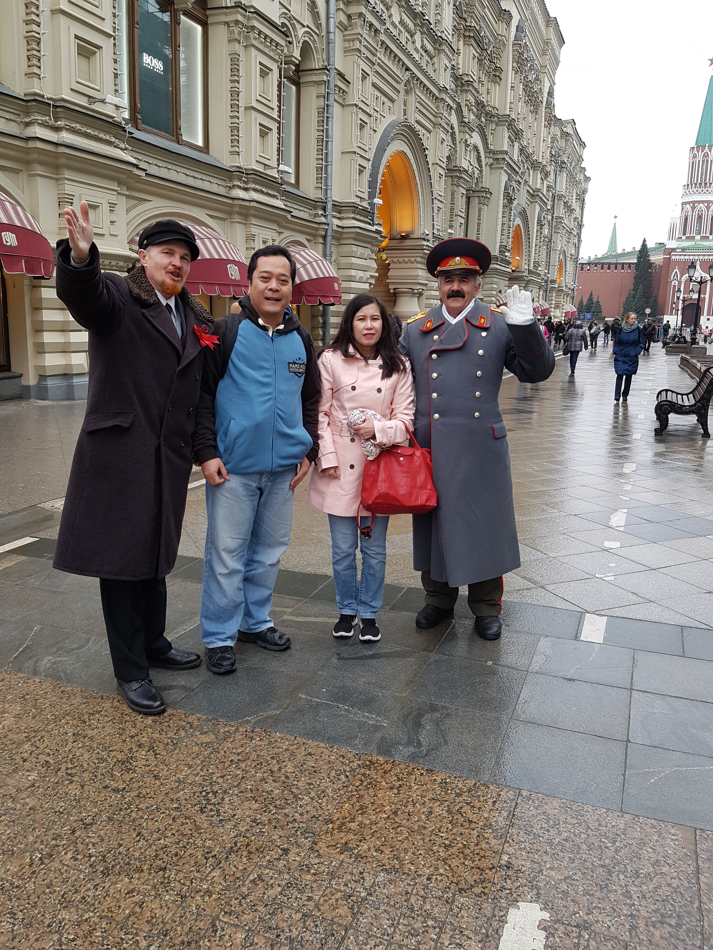 Minggu pagi, setelah sarapan, kami berangkat dari stasiun Partizanskaya menuju lapangan merah lagi. Kenapa kesana lagi? Karena pemandangan disini berbeda antara malam dan siang hari. Kami sampai di areal lapangan merah sekitar pukul 9.30 pagi. Saat menuju lapangan merah dan mengambil foto.. seseorang menghampiri kami, dia menawarkan mengambilkan foto saya dan istri. Dia tanya, where are you from? China? Kita jawab dari Indonesia. Lalu dia bilang, let’s take pictures with my friends, I am Stalin and my friend is Lenin sambil menunjuk temannya yang berpakaian dan berdandan ala Lenin. Saat itu saya langsung sadar, ini orang2 yang berprofesi sebagai aktor foto bayaran. Tapi boleh juga lah, buat foto lucu2an. Selesai berfoto, seperti yang sudah saya duga, mereka minta uang, we are professional actors.. pay us money. Saya tanya berapa, mereka minta 1.000 rubels per orang. Saya bilang kemahalan, saya kasih aja 500 rubels untuk mereka bertiga, mereka lalu minta 500 per orang. Saya bilang, you didn’t tell me before, 500 for all of you. Abis itu saya tinggalin aja, untung mereka nggak ngotot 🙂