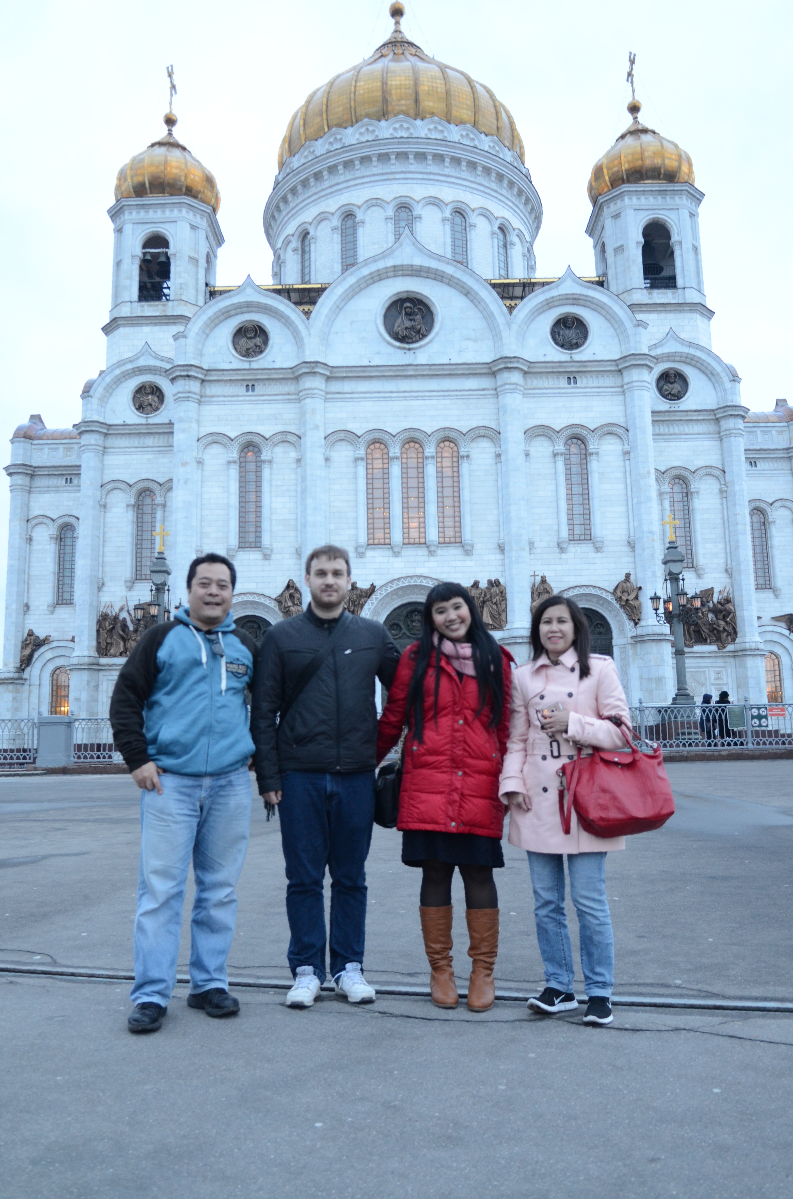 Sekitar jam 6 sore saya janjian dengan Natalie, mahasiswi Indonesia yang kuliah S2 di Moscow. Tak lama dia datang bersama temannya, penduduk asli Moscow. Natalie dan Alex menanyakan kami sudah kemana aja, dan mau liat apa lagi. Kami lalu di sarankan ke White Cathedral (Christ the Saviour) yang merupakan gereja utama di Moscow. Kami naik metro sejauh 2 stasiun dari lapangan merah. Sampai disana, sekitar jam 7 malam, langit sudah mulai senja, dan lampu-lampu mulai dinyalakan. Sekilas, White Cathedral ini bentuknya mirip masjid raya Banda Aceh 😀