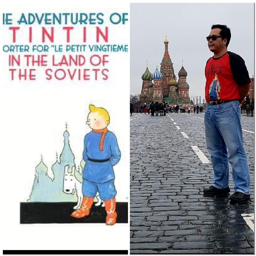 Kami lalu melanjutkan foto-foto di seputar lapangan merah. Karena ini minggu pagi, gereja2 yang ada di sekitar lapangan merah banyak didatangi umat yang mengikuti kebaktian. Di lapangan merah ini saya kemudian mencoba mereplikasi pose cover komik Titin di Soviet, dengan mengenakan kaos Tintin di Soviet. Meskipun pagi itu suhu udara 1 derajat celcius, saya paksain berpose dengan hanya mengenakan kaos tipis.. brrrr…
