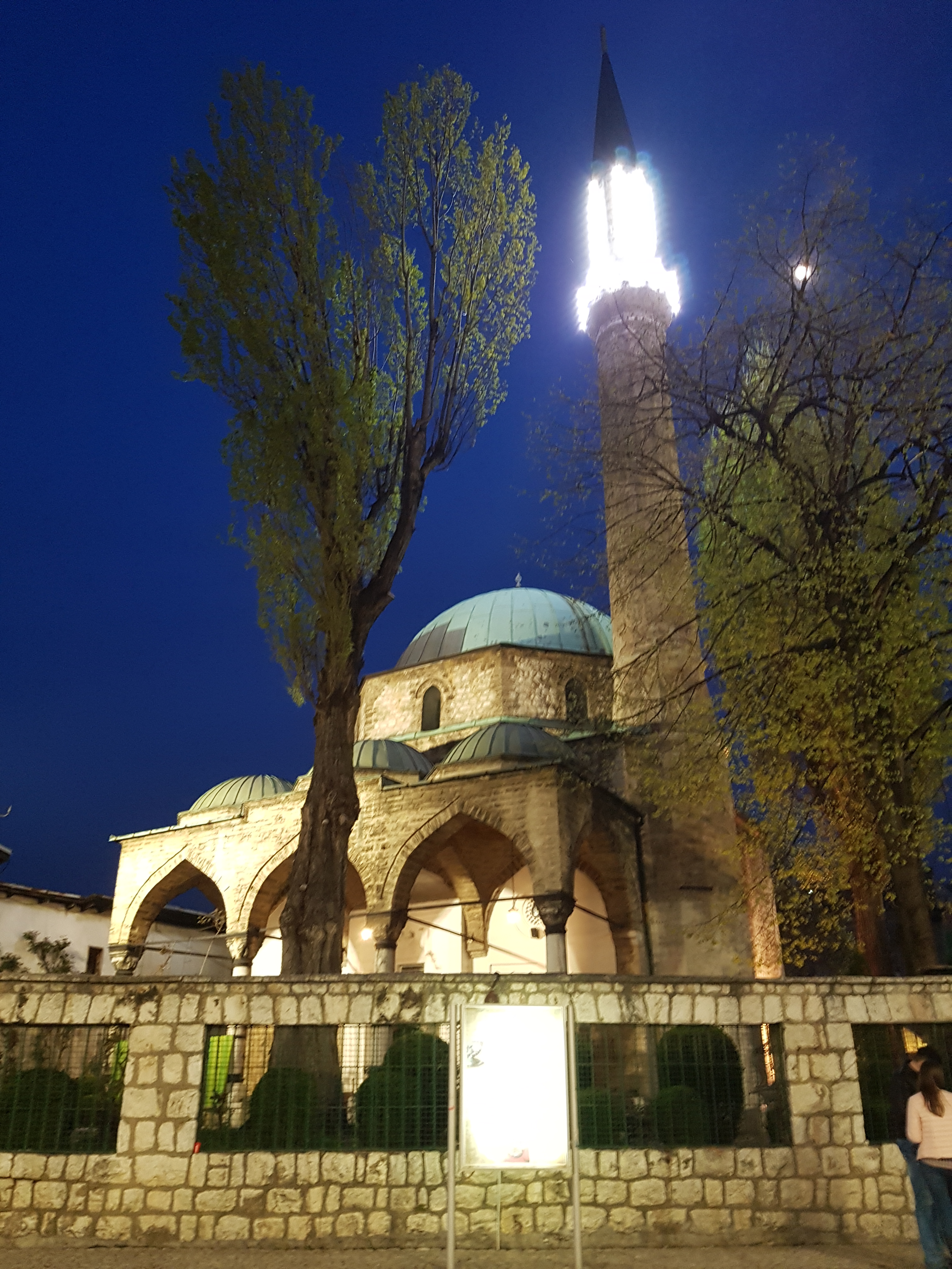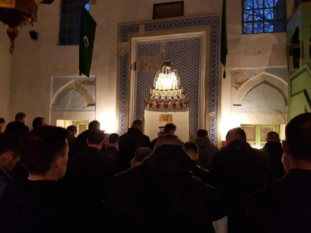 Saat kami sampai di old bazaar, waktu sudah sekitar pukul 18.30, saya kemudian ke masjid Dzamija untuk shalat jama’ dzuhur dan ashar, sekalian  nunggu waktu maghrib. Saat saya shalat, terasa beberapa warga lokal ngeliatin saya shalat, yang mungkin terlihat lain sendiri dengan cara shalat warga sana. Setelah saya shalat jama’, gantian saya yang memperhatikan bagaimana warga lokal shalat. Ada beberapa perbedaan dengan cara shalat orang Indonesia. Misalnya, umat muslim Bosnia hanya mengangkat tangan saat takbir pertama saja, selebihnya pada saat rukuk, itidal maupun bangun dari sujud, mereka tidak mengangkat tangan. Saat tahiyat juga tidak menunjukan jari telunjuk. Beberapa jamaah malah tidak duduk saat tahiyat, tapi seperti berlutut.