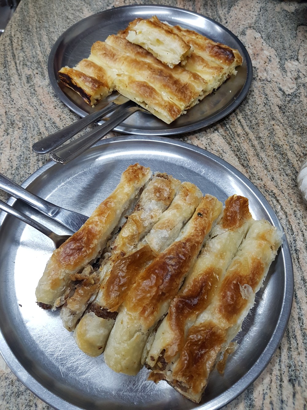 Menunya  Burek, semacam pastry, isinya ada yang pakai daging sapi, keju, bayam atau tomat. Jika kita pesan, di potong-potong lalu di timbang. Per porsi harganya hanya 5 Marka, atau Rp 36 ribu. Kami memilih yang isi keju dan daging sapi. Makan di Sarajevo ini sangat muslim friendly, kebanyakan restoran disini halal-certified, Bosnia-Herzegovina memang mayoritas warganya muslim.