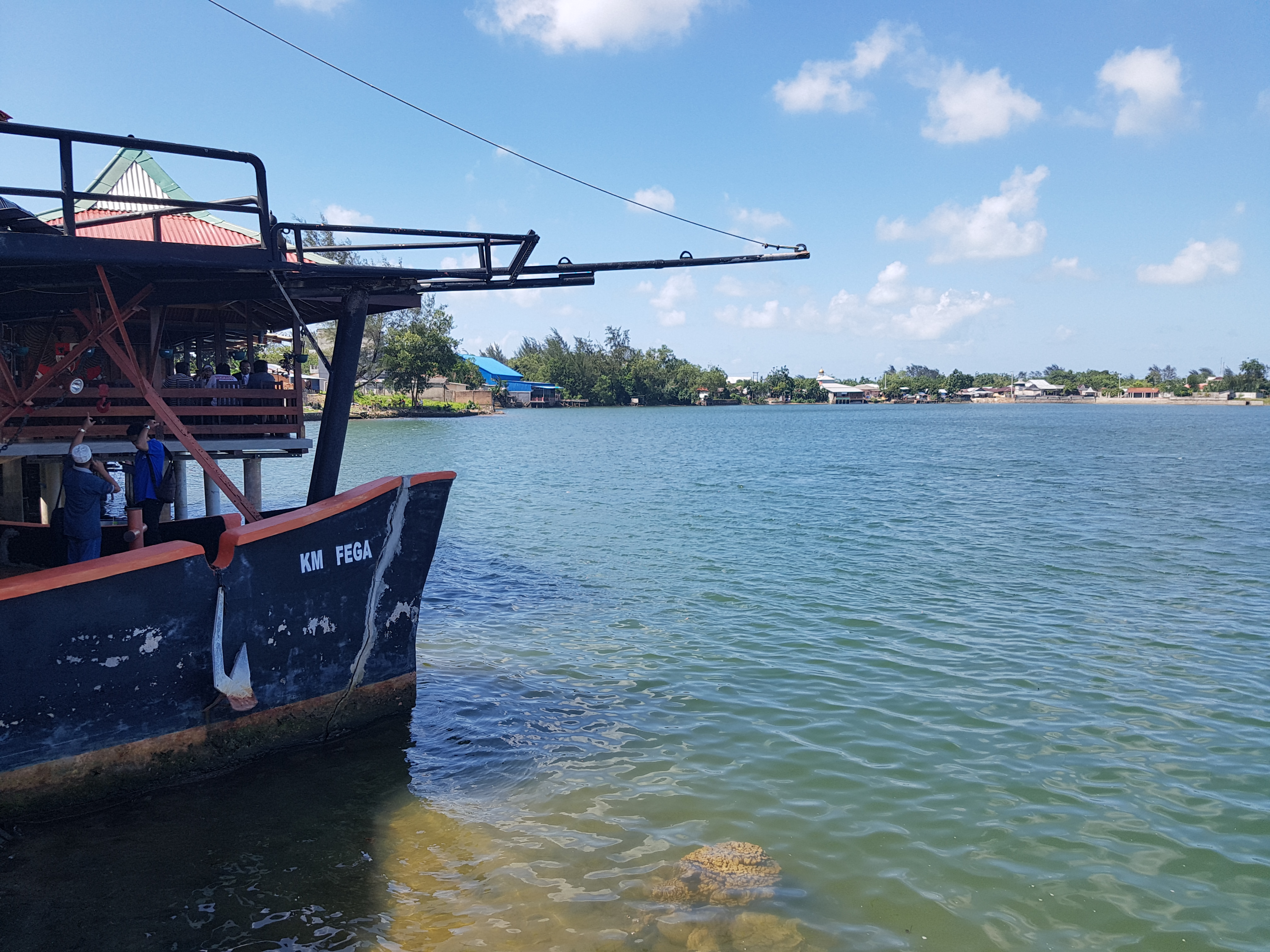 Kami melanjutkan perjalanan ke kawasan danau air asin, untuk makan siang di salah satu restoran yang ada di tepi danau. Danau ini awalnya merupakan bekas lubang galian tambang timah yang telah di eksploitasi puluhan tahun lalu. Karena tidak di reklamasi, bekas galian lama kelamaan terisi rembesan air laut yang jaraknya tidak jauh. Jadi danau ini cukup unik, ada di di tengah daratan, namun airnya asin seperti layaknya air laut, biota yang ada di danau ini juga merupakan biota laut. Makan di resto Fega ini asik pemandangannya, meskipun rasa makanannya biasa saja.