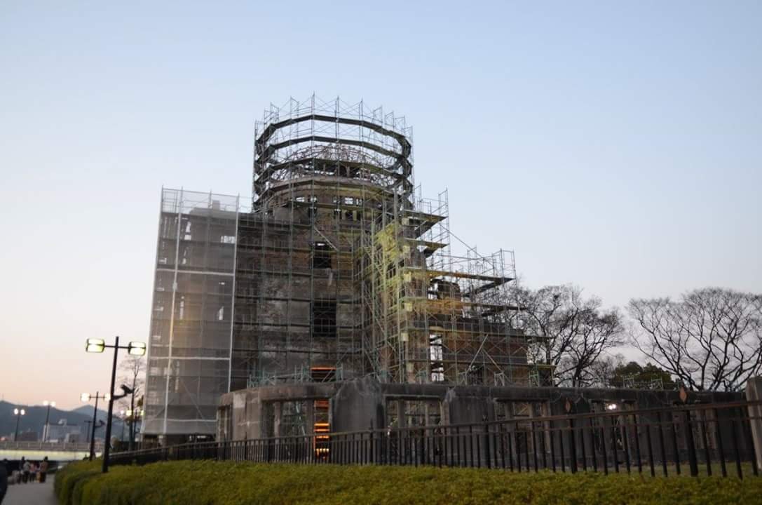 Nama dalam bahasa Jepang gedung ini adalah Genbaku Domu. Gedung ini diresmikan tahun 1915, sebagai gedung pameran komersial Hiroshima (Hiroshima Prefecture Commercial Exhibition). Tanggal 6 Agustus 1945, jam 8:15 pagi, pesawat bomber B-29 yang diberi nama Enola Gay, menjatuhkan bom atom ‘Little Boy’ di Hiroshima. Titik pusat ledakan sesungguhnya ada di ketinggian beberapa ratus meter di udara, namun jika ditarik garis lurus, titik pusat ledakan (hypocenter) berada di rumah sakit Hiroshima, jaraknya sekitar 500 meter dari Atomic Bomb Dome ini. Saat kami mengunjungi atomic bomb dome, situs bersejarah ini sedang dalam perawatan, sehingga banyak tiang-tiang penyangga yang menutupi pemandangan.