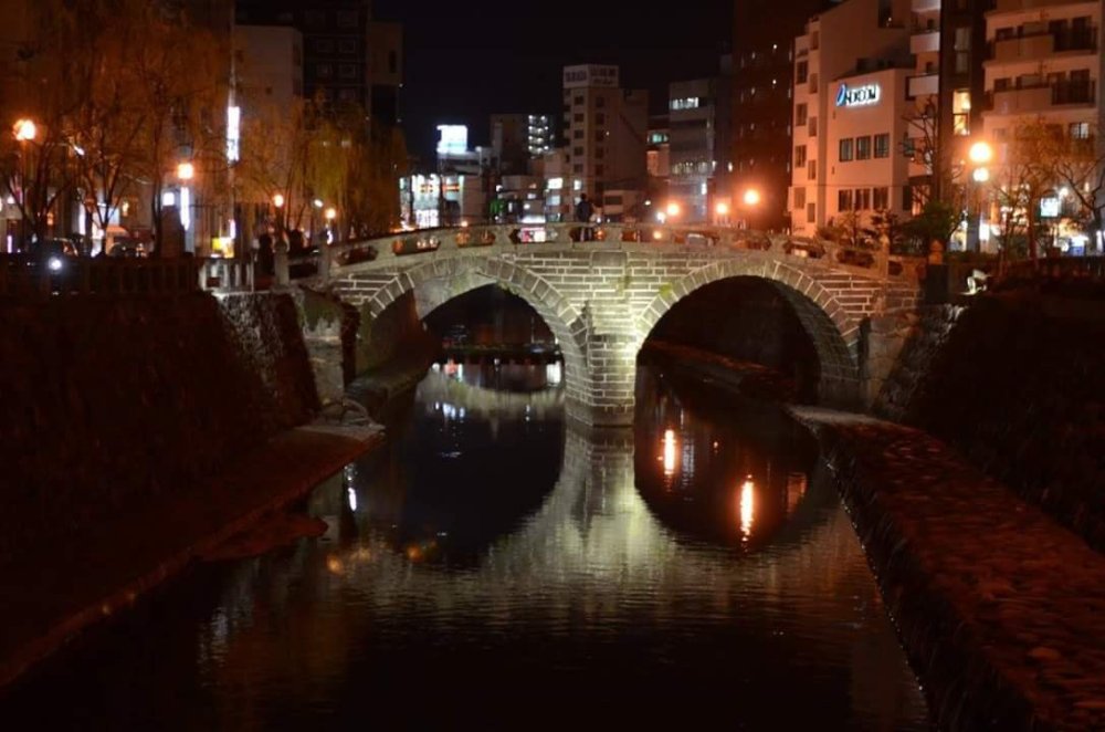 Pertama kami di ajak ke jembatan kacamata (spectacles bridge), jembatan ini tiang penopangnya berbentuk dua busur setengah lingkaran, di malam hari, lampu-lampu di sekitar jembatan dan bayangan dua busur ini membentuk dua lingkaran, seperti kacamata. Sungai yang mengalir di bawahnya sangat bersih, dan banyak di sediakan batu pijakan bagi wisatawan yang ingin bermain air ke tengah sungai. Dari spectacles bridge, kami diajak ke lokasi dimana bom atom ‘Fat Man’ di jatuhkan pada tanggal 9 Agustus 1945.