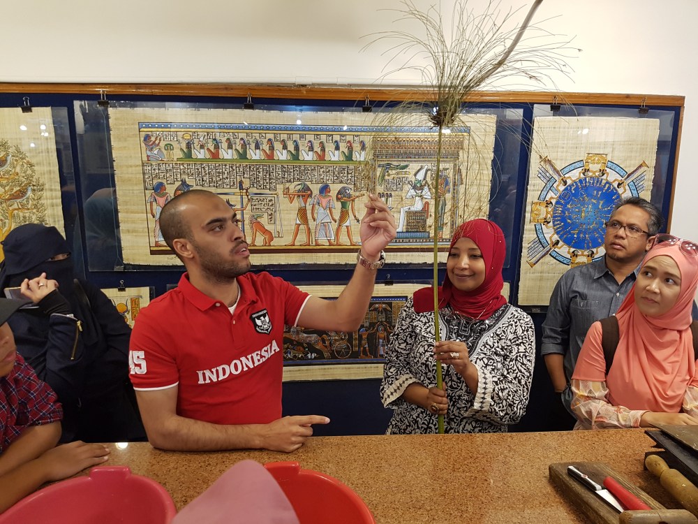 Paginya, tanggal 4 September, setelah sarapan, kami di ajak ke musium papyrus. Untuk melihat sejarah kertas papyrus pertama didunia yang dibuat oleh bangsa Mesir 4000 tahun lalu, dan demo proses pembuatan kertas dari tanaman papyrus. Namun ujung-ujungnya biasalah, peserta tour diarahkan untuk membeli produk hiasan dinding dari papyrus ini. 😀
