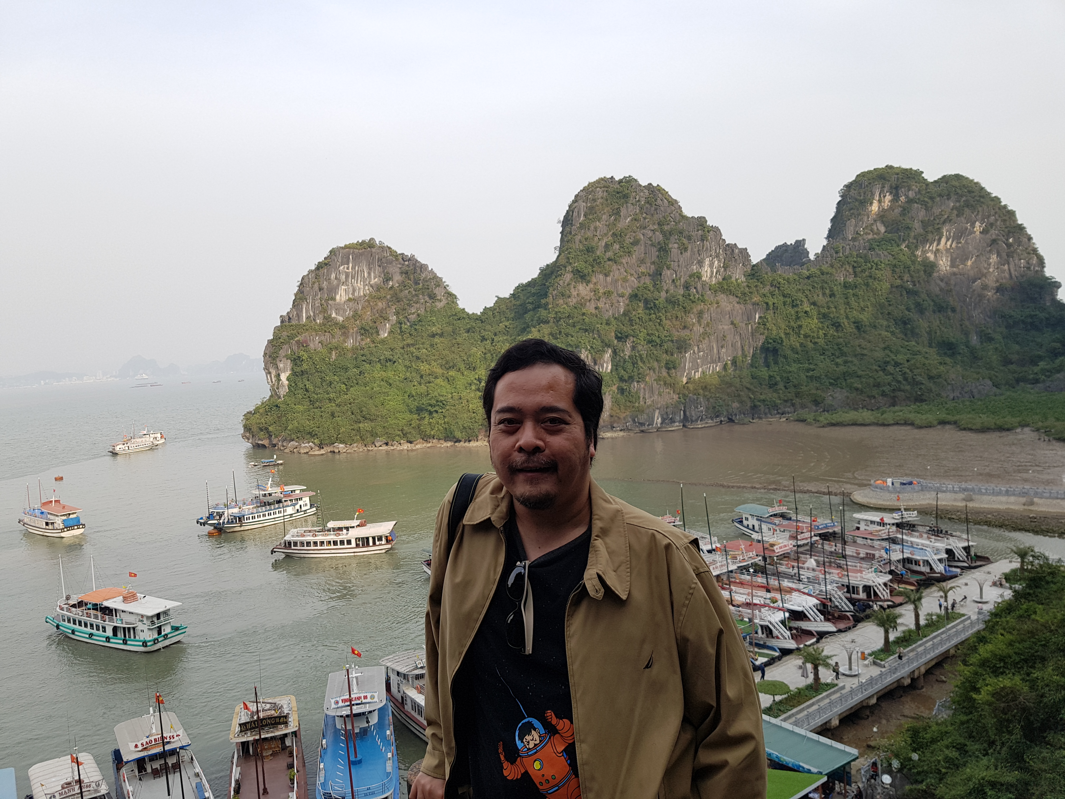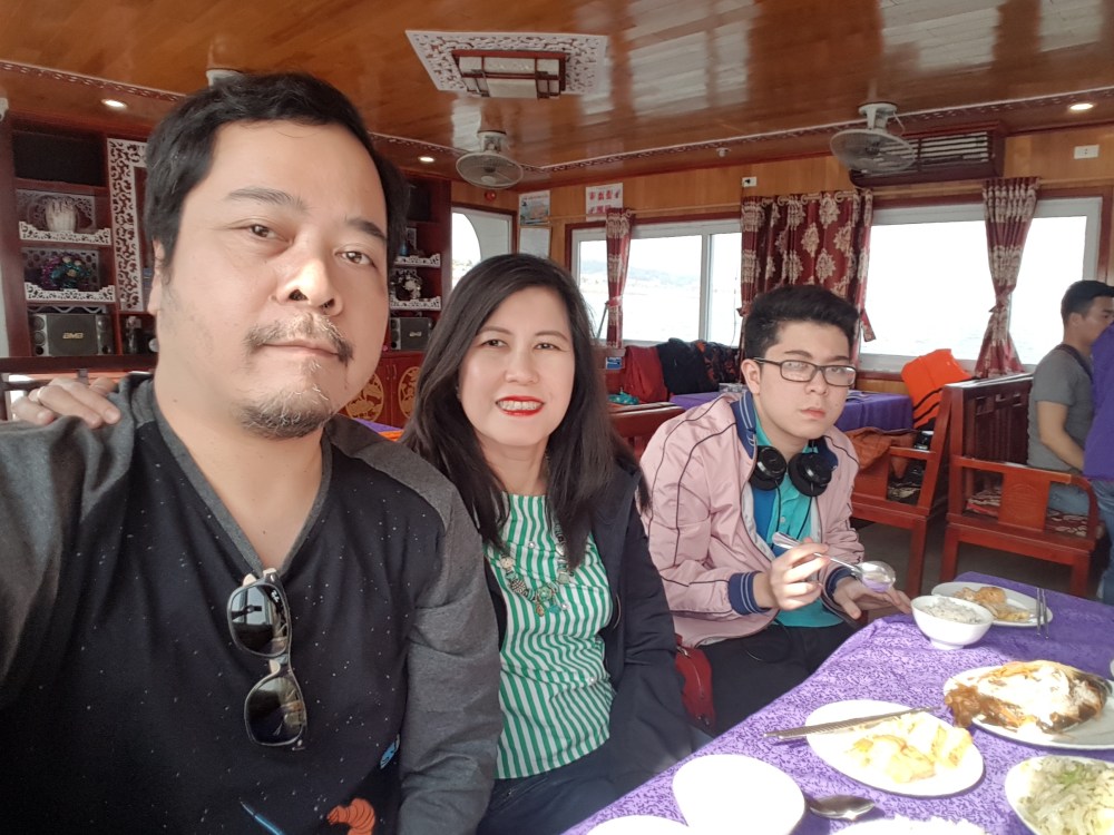 Jam 12.30 kami tiba di Ha Long bay. Setelah menunggu pembagian tiket di terminal perahu, kami di arahkan menuju perahu nomor 99. Tak lama perahu meninggalkan dermaga dan makan siang segera disajikan diatas kapal. Menunya ikan mas stim, cumi tumis bawang, telur dadar, tahu dan sayur tumis kol. Rasa makanannya tidak istimewa, yang dijual lebih pengalaman makan diatas perahunya.