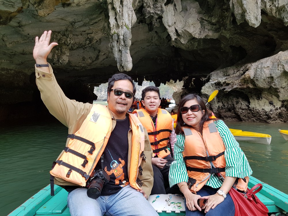 Setelah makan, kami di bawa ke perhentian pertama, untuk bersampan di seputar Ha Long bay. Pilihannya ada 2, naik Canoe untuk dua orang, dayung sendiri, atau naik rakit bambu yang di dayung pemandu. Kami memilih naik rakit bambu, dan ternyata pendayungnya ibu-ibu. Semua pendayung rakit disini wanita separuh baya. Kami dibawa ke beberapa pulau di sekitar Ha Long bay selama sekitar 30 menit, melewati beberapa gua alam.