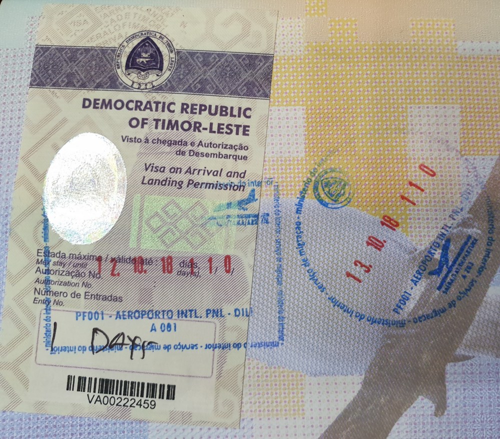 Untuk masuk ke Timor Leste, pemegang paspor Indonesia wajib membayar Visa on Arrival sebesar USD 30 di Bandara Dili atau di perbatasan jika masuk Timor Leste lewat darat.