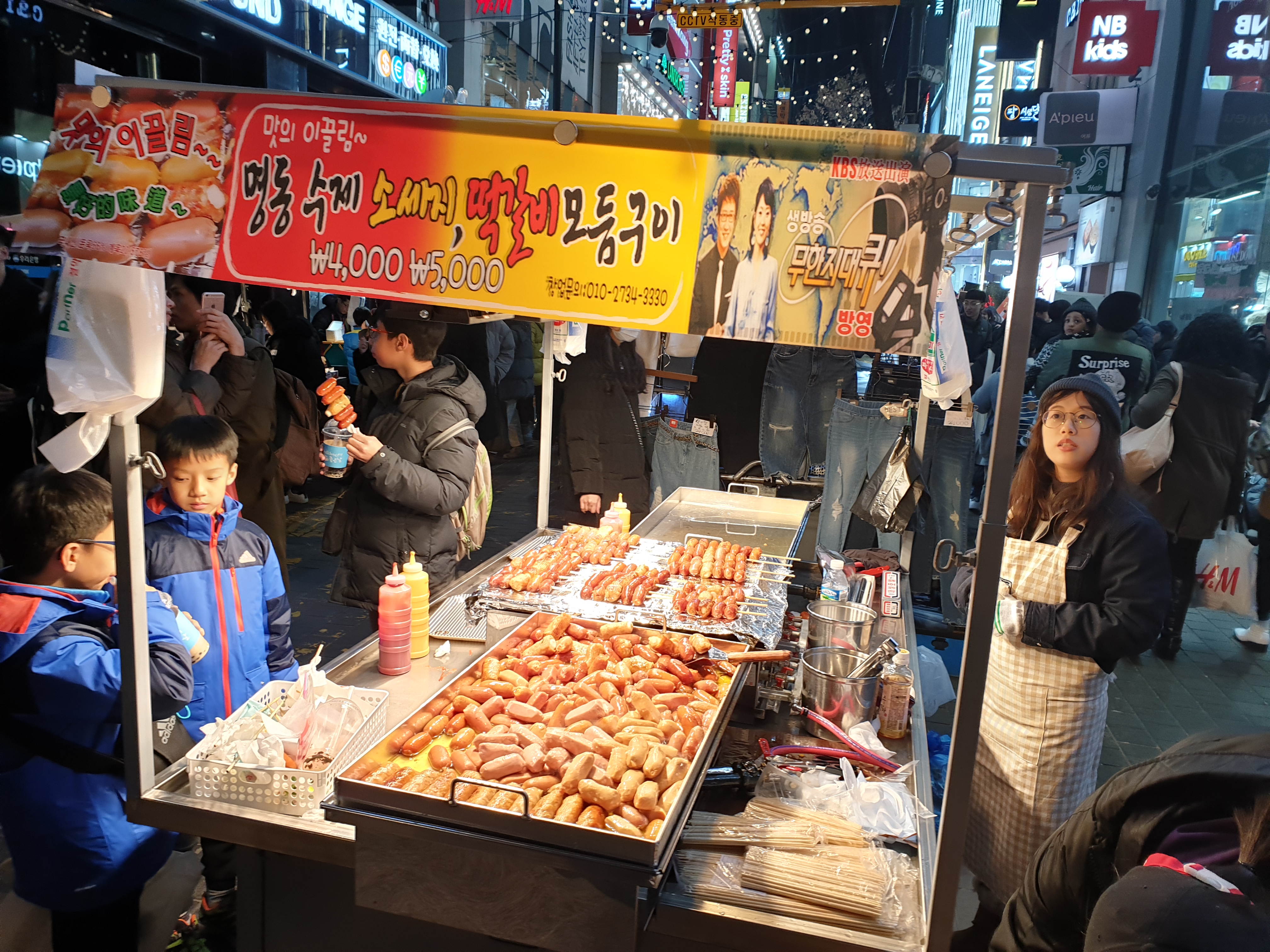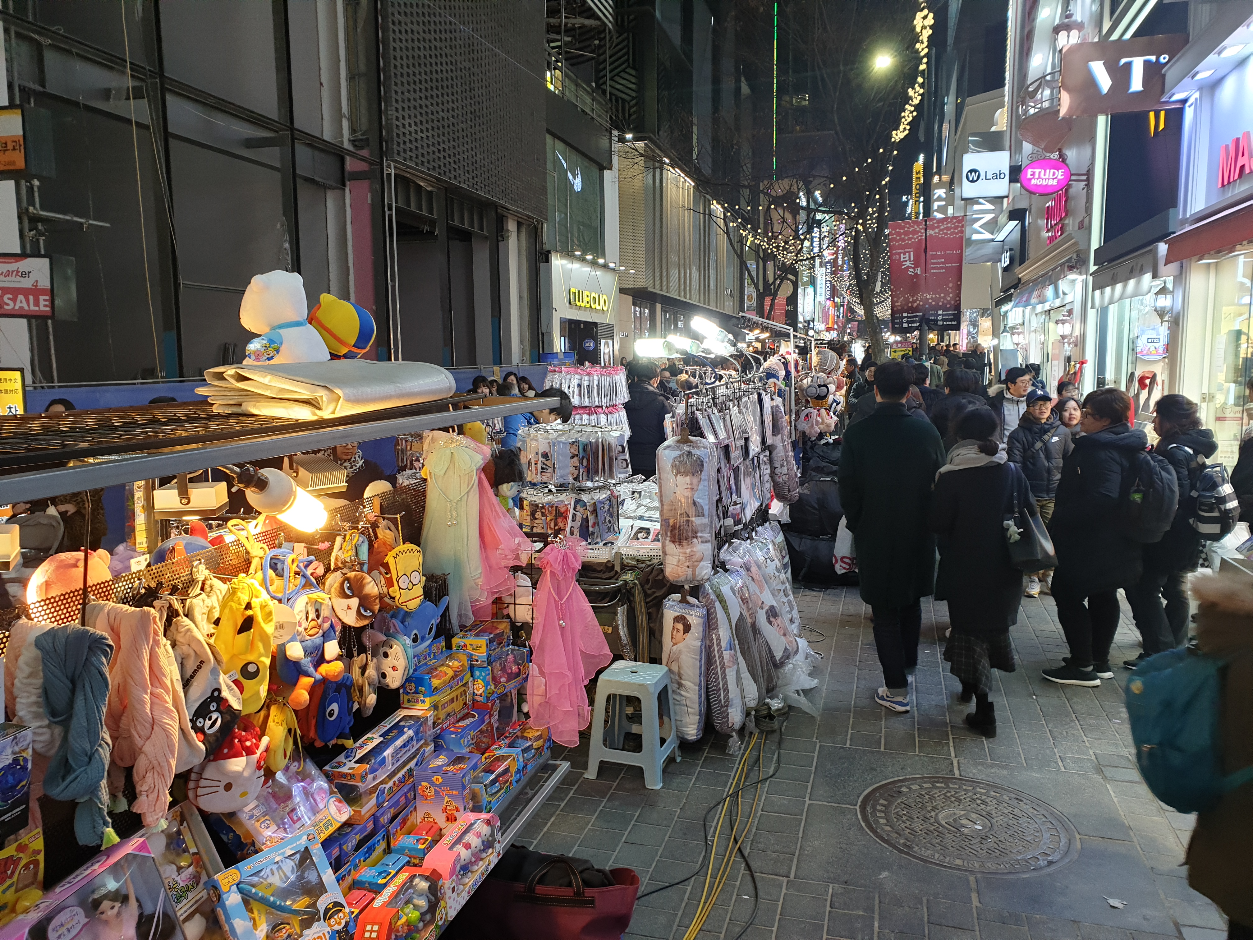 Saat saya berkunjung ke Myeong Dong pada akhir Desember 2019, suhu udara sekitar minus 4 derajat celcius, namun pasar malam terbuka ini tetap ramai pengunjung, membuat udara dingin tidak terlalu terasa. Meskipun Korea selatan termasuk negara maju yang cukup menghargai hak intelektual, di pasar malam Myeong Dong ini cukup banyak lapak-lapak yang menjual produk KW, terutama produk fashion.