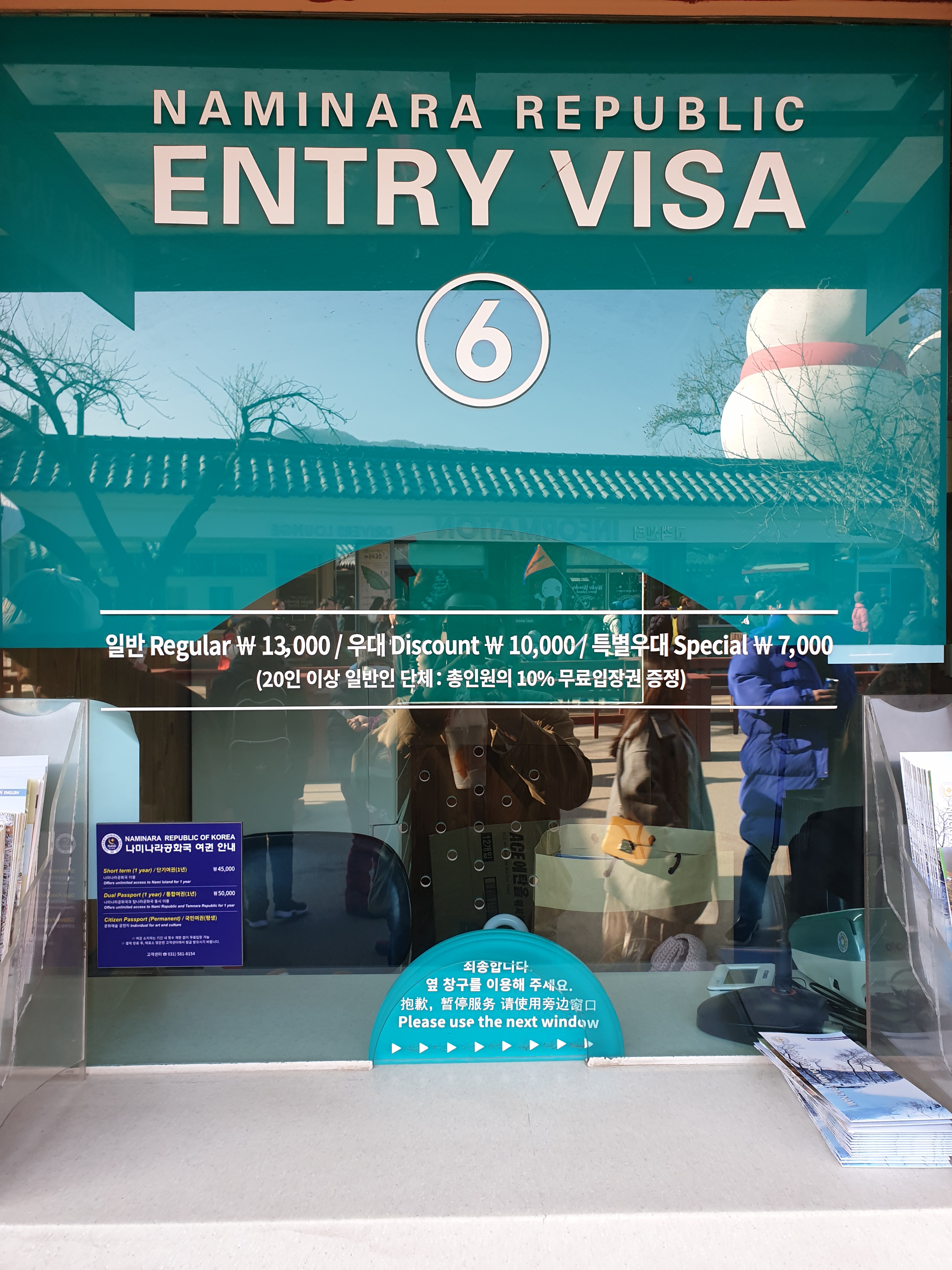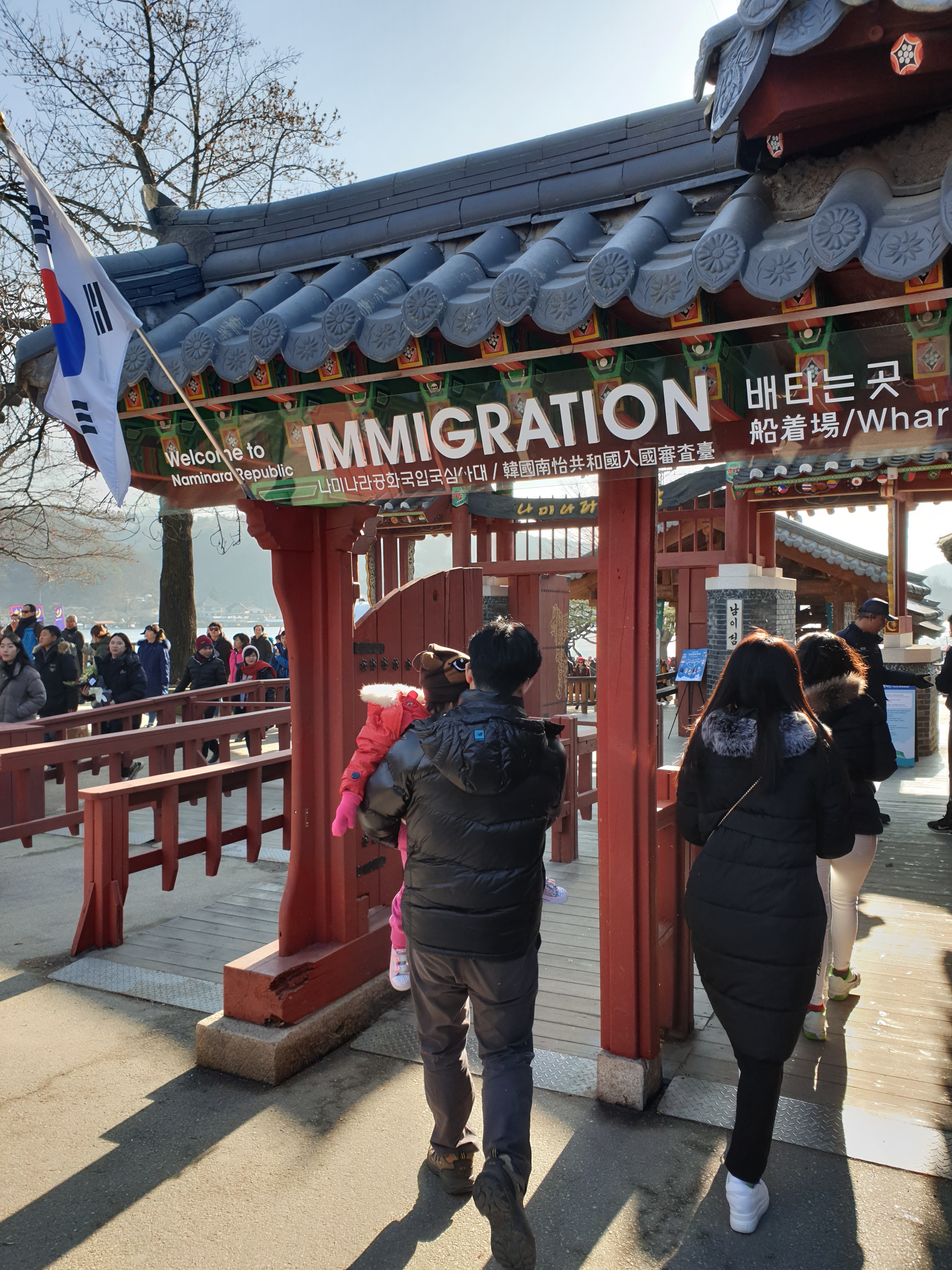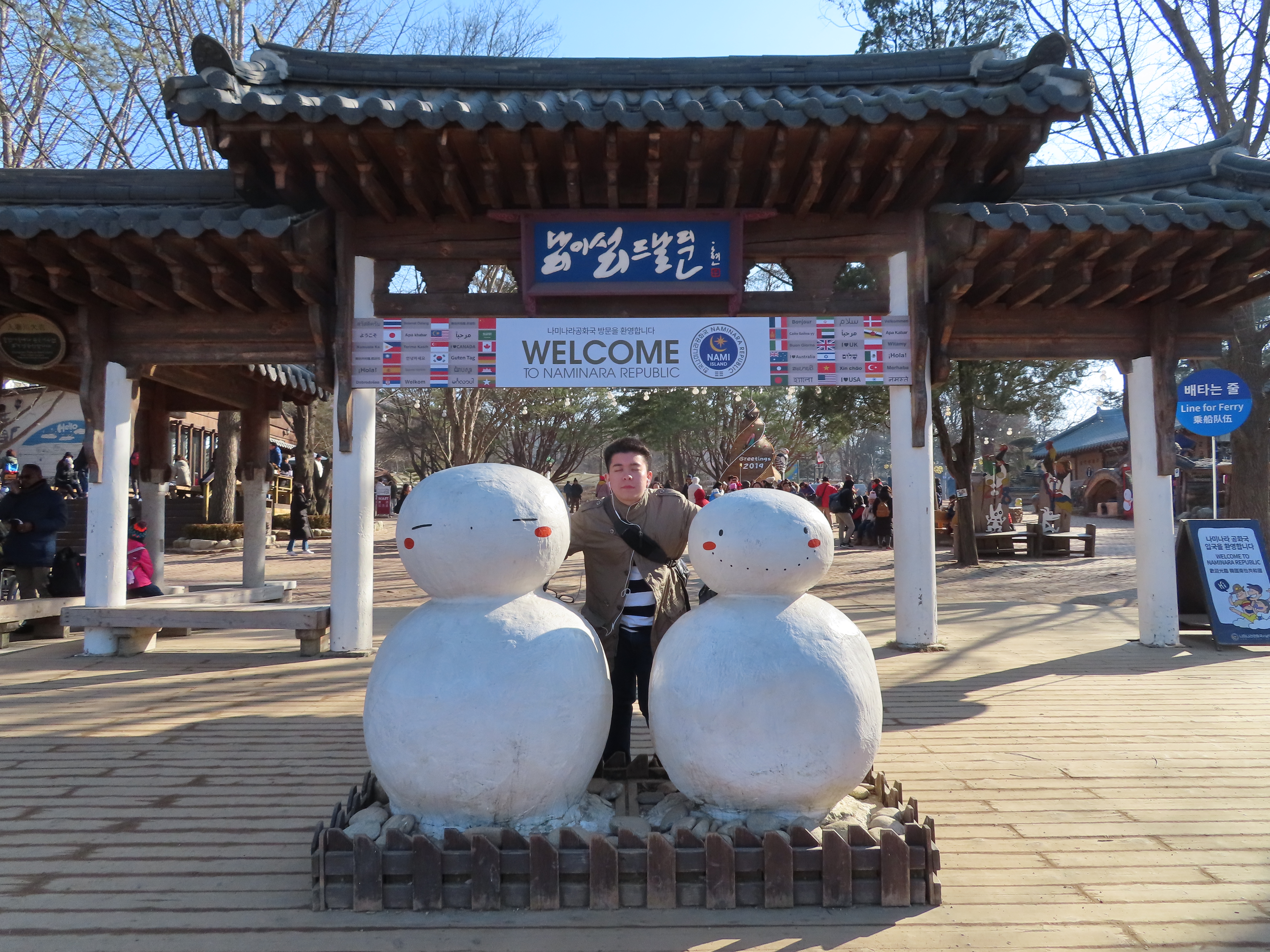 Naik ferry menuju Nami island hanya memakan waktu sekitar 10 menit. Setibanya di Nami island, pengunjung dapat mengambil peta Nami island di information center, sebagai bekal untuk mengeksplorasi pulau seluas 430.000 meter persegi ini. Pulau berbentuk setengah bulat ini memiliki diameter sepanjang 4 kilometer. Salah satu jalan setapak utama di pulau ini diapit deretan pohon pinus di kiri-kanan jalan, merupakan lokasi favorit pengunjung untuk berfoto ala Winter Sonata.