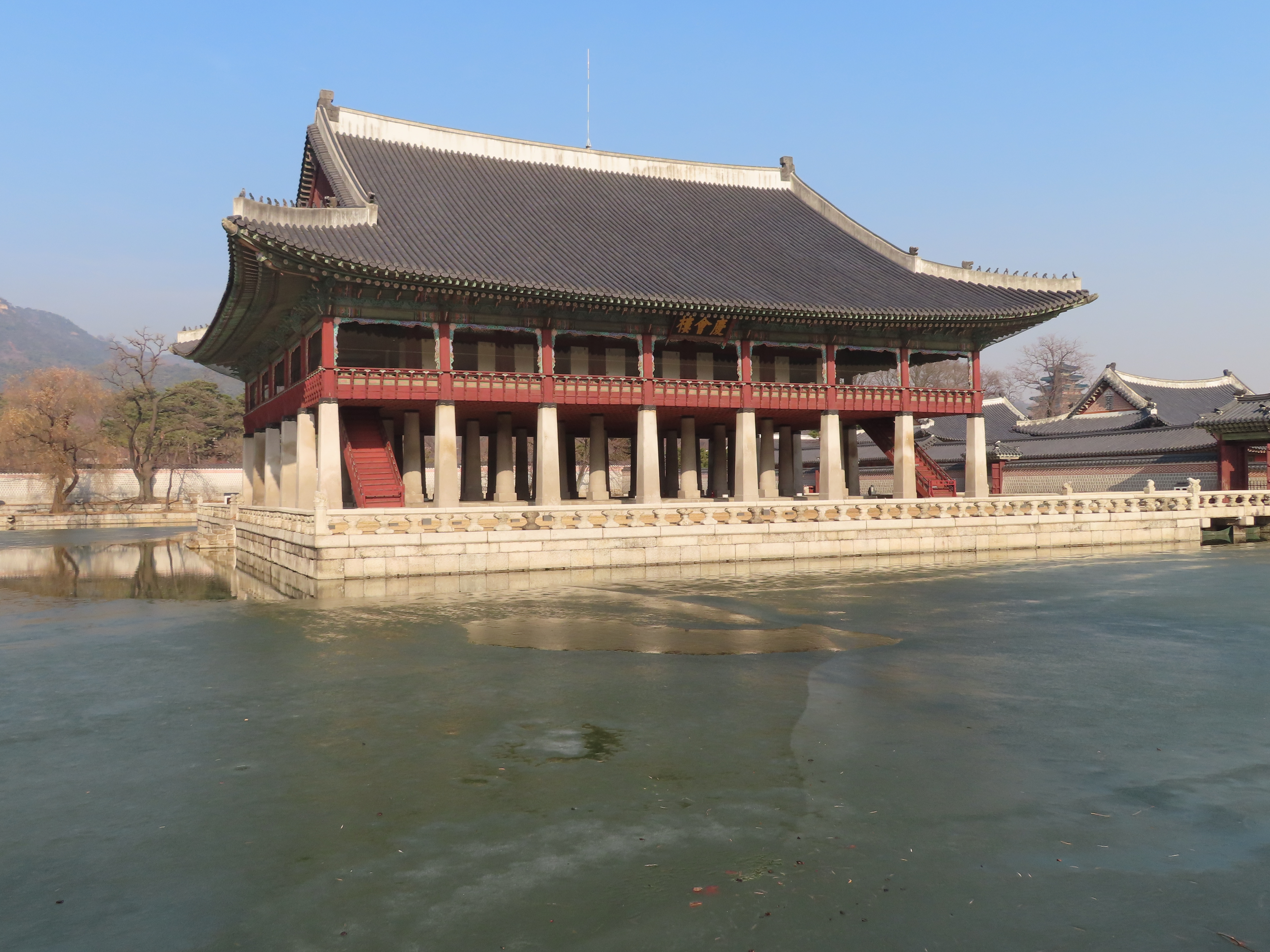 Di kompleks Gyeongbokgung ini terdapat telaga yang di tengahnya terdapat bangunan Gyeonghoeru. Tempat ini adalah tempat jamuan tamu-tamu kekaisaran. Saat saya disana, sebagian telaga sudah membeku karena musim dingin. Sayang saat kami disana wisatawan tidak diperkenankan masuk ke gedung Gyeonghoeru ini.
