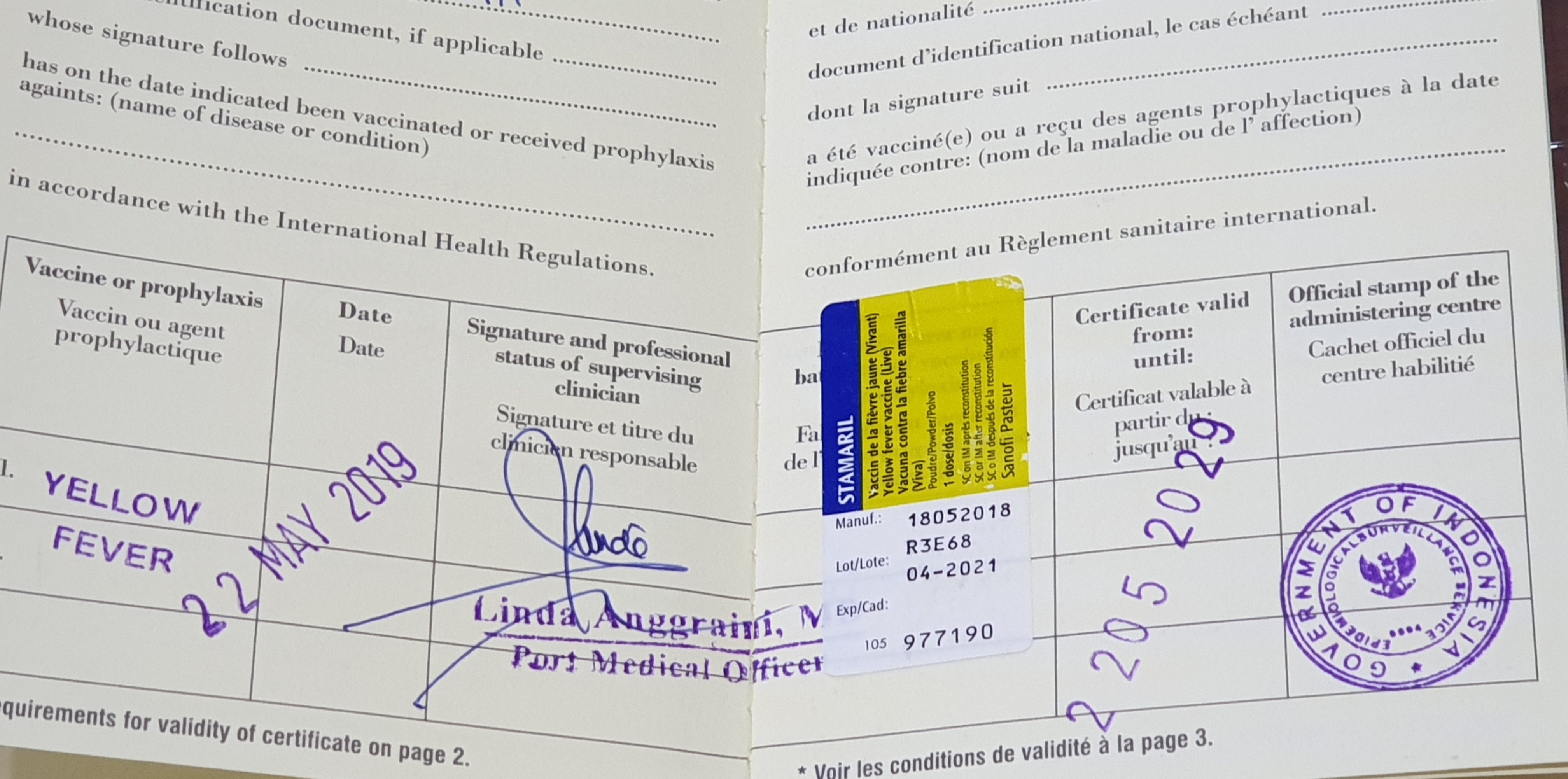 Buku sertifikatnya sama dengan buku sertifikat vaksin meningitis untuk keperluan haji dan umroh ke Arab Saudi. Jika anda masih memiliki buku sertifikat meningitis yang kurang dari 2 tahun, bukti vaksin yellow fever bisa digabungkan dalam buku sertifikat meningitis. Masa berlaku sertifikat vaksin meningitis adalah 2 tahun, sementara vaksin yellow fever 10 tahun.