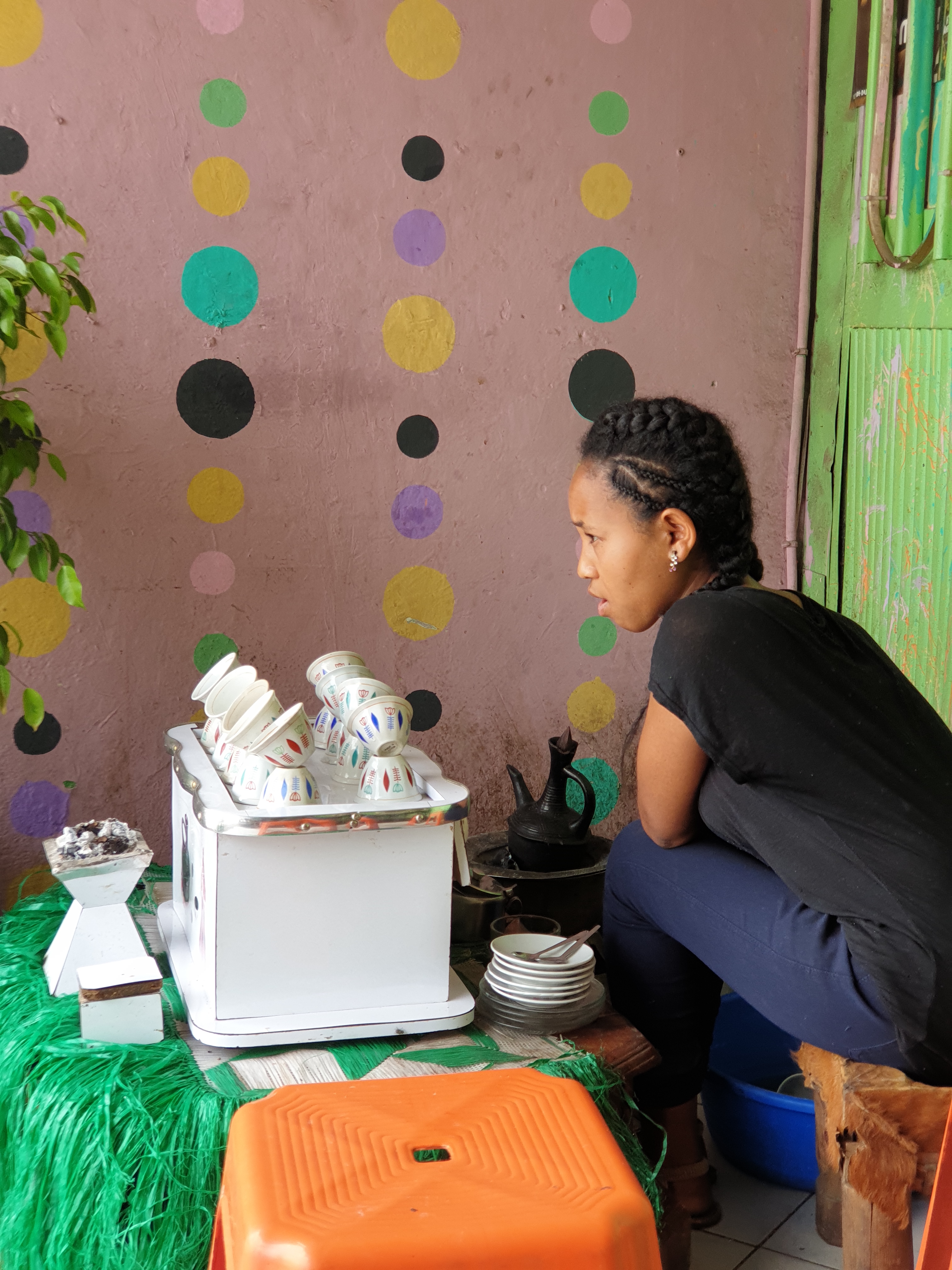 Ethiopia terkenal dengan kopinya. Kopi arabica yang dihasilkan Ethiopia konon merupakan salah satu kopi terbaik di dunia. Saat jalan-jalan melewati kawasan Meskel Flower ini, banyak sekali kedai kopi, baik yang bergaya modern maupun tradisional. Saya lalu mampir di salah satu warung kopi dipinggir jalan, ingin coba juga kopi kampung ala Addis Ababa ini. Cangkir kopinya kecil, saat kita pesan, kopinya dipanggang saat itu juga, lalu digiling dan dirajang, dengan cara tradisional. dijamin fresh. Kopi seharga 5 Birr (Rp. 2.500) ini terasa kuat aromanya.