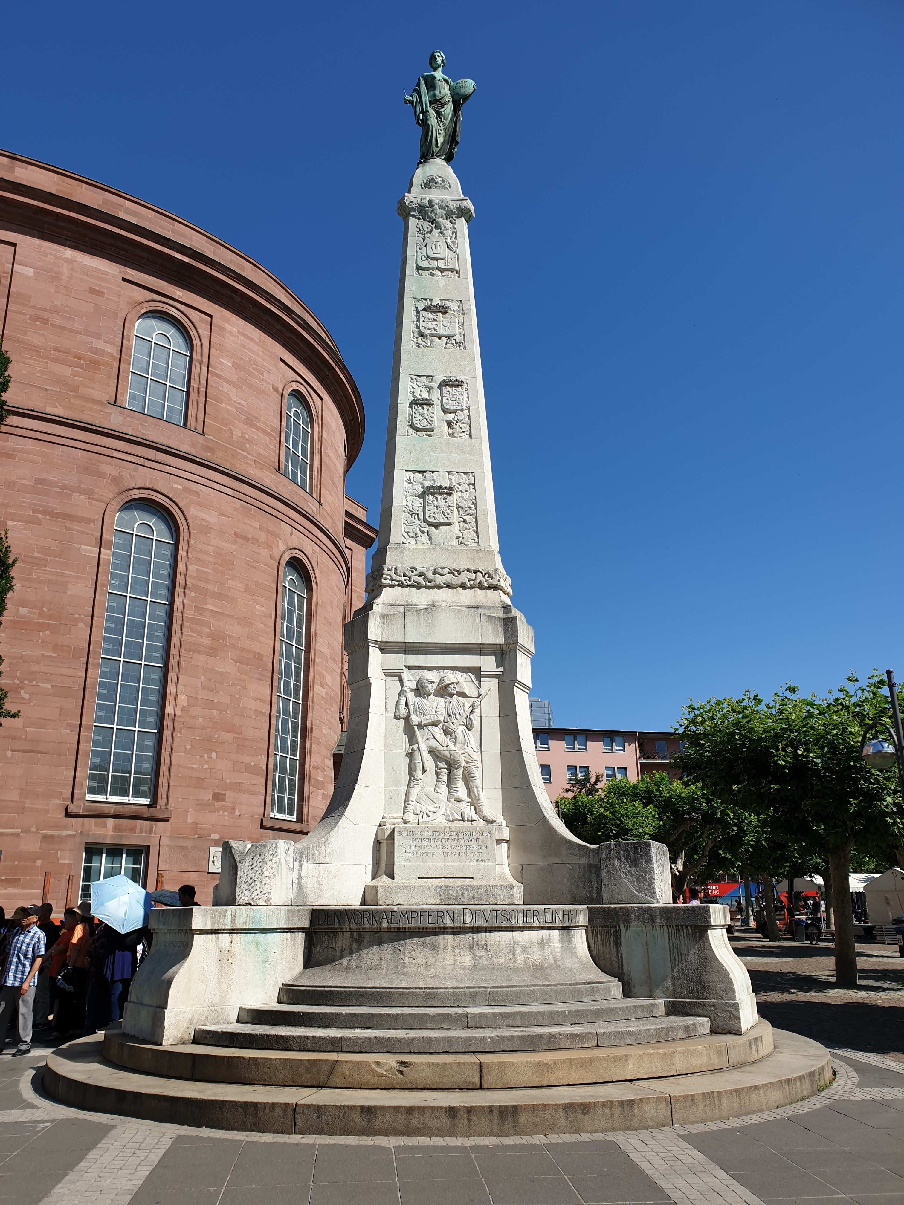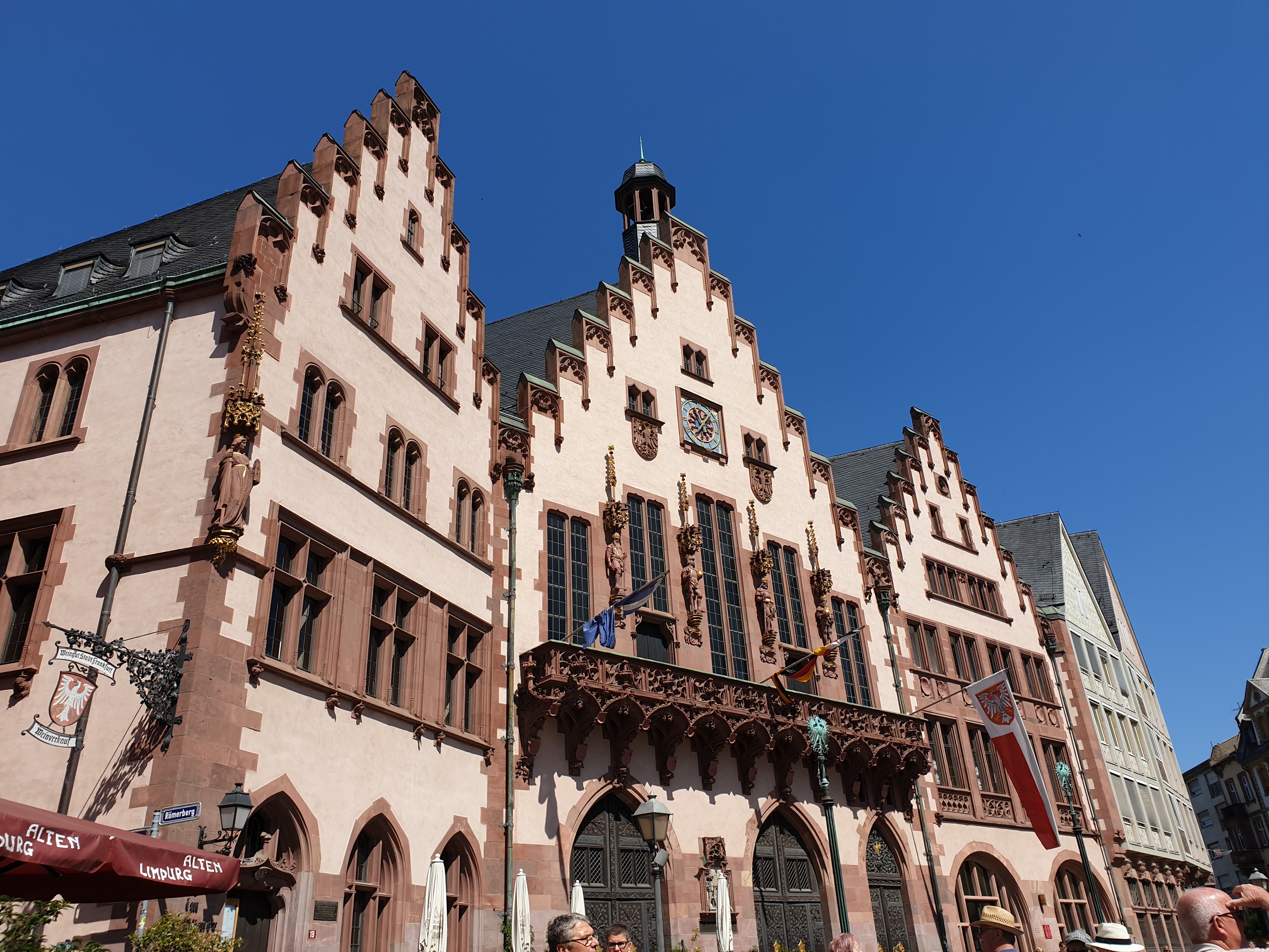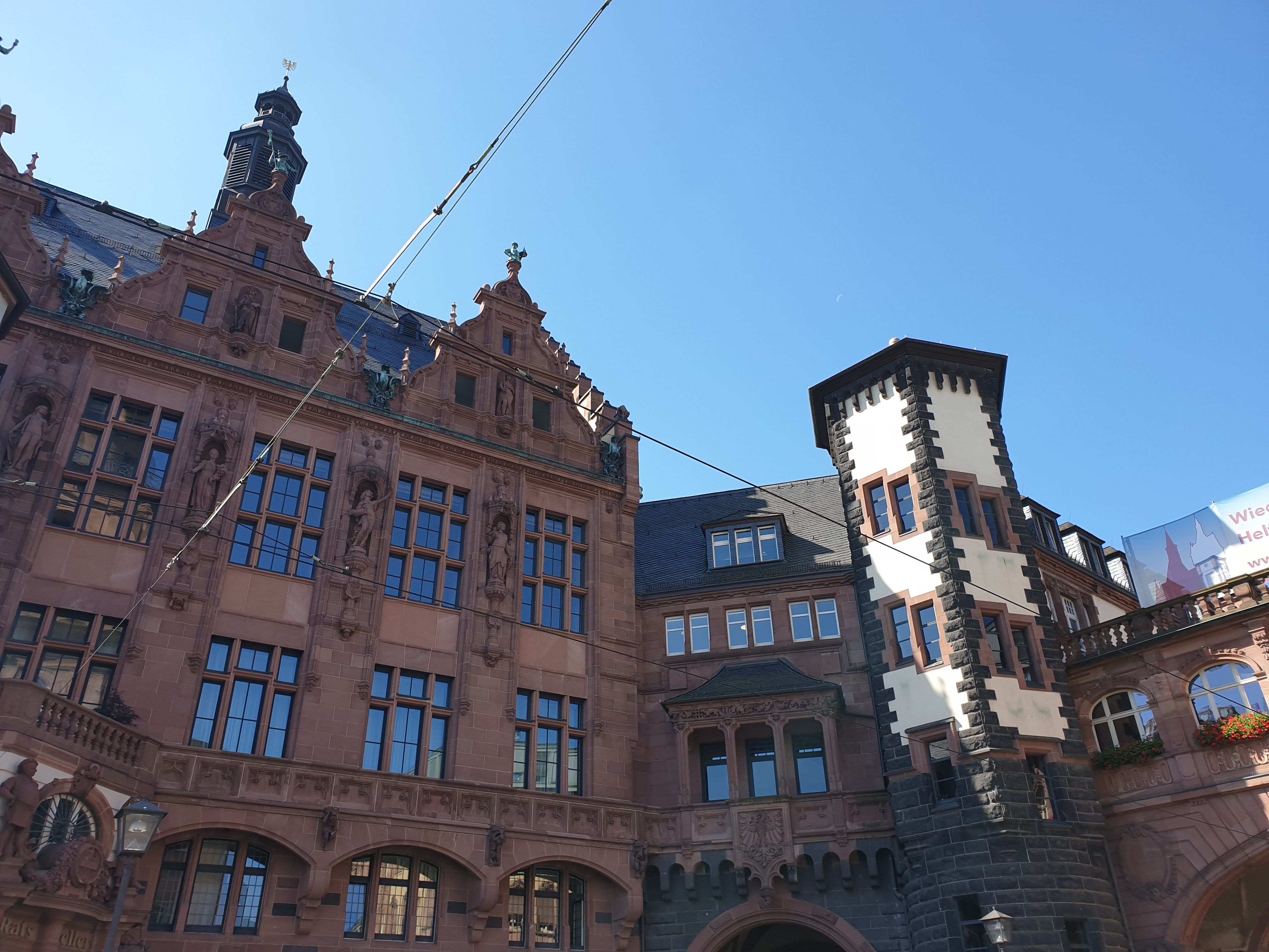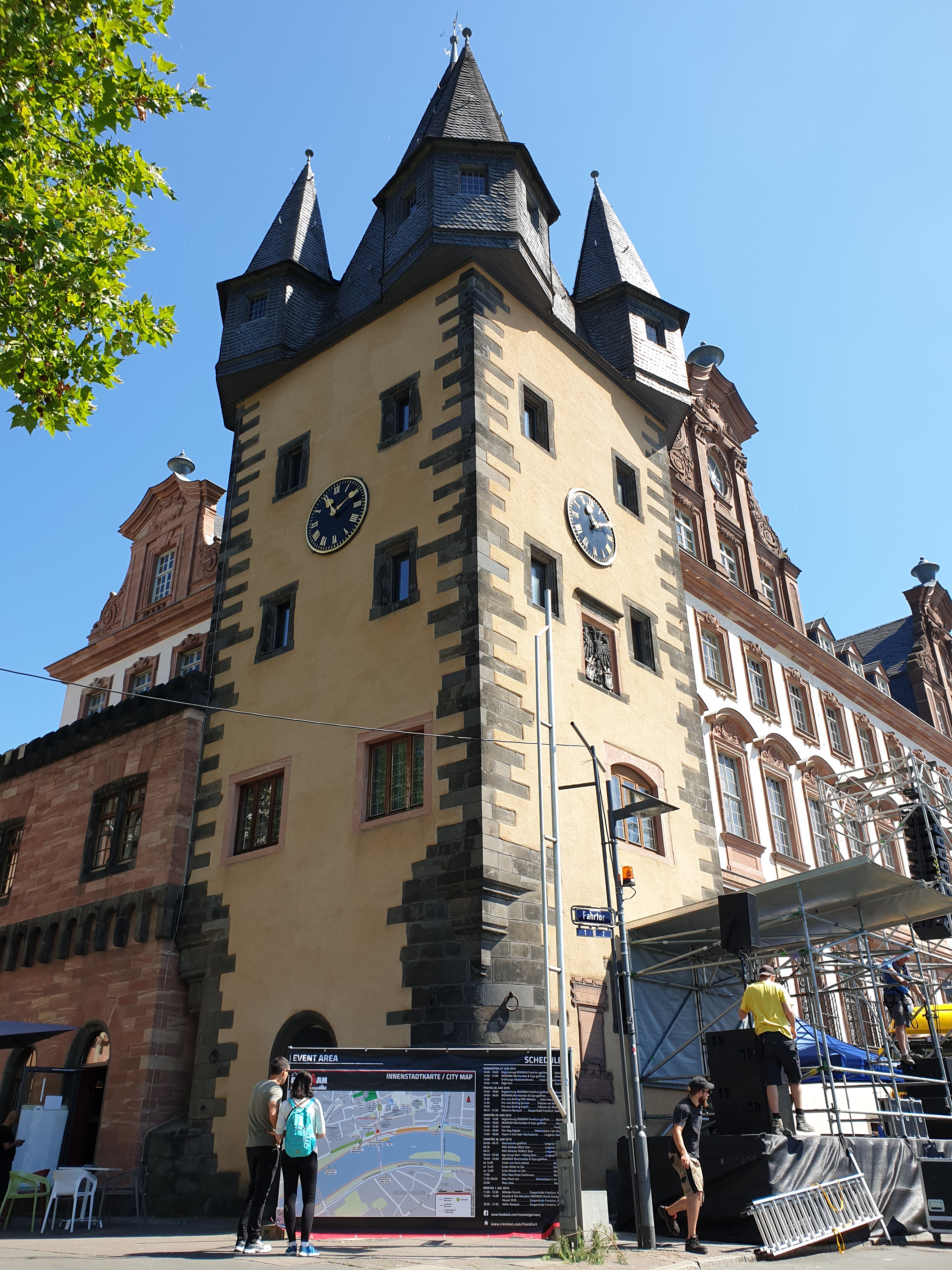 Bangunan yang pertama terlihat adalah gedung balai kota (Römer), di depan gedung ini ada beberapa monumen dan juga ada information centre. Melewati gedung Römer, saya tiba di lapangan Römerberg. Tapi sayangnya saat saya tiba disana, sebagian besar lapangan sedang disiapkan untuk panggung pertunjukan dengan scaffolding untuk bangku penonton.
