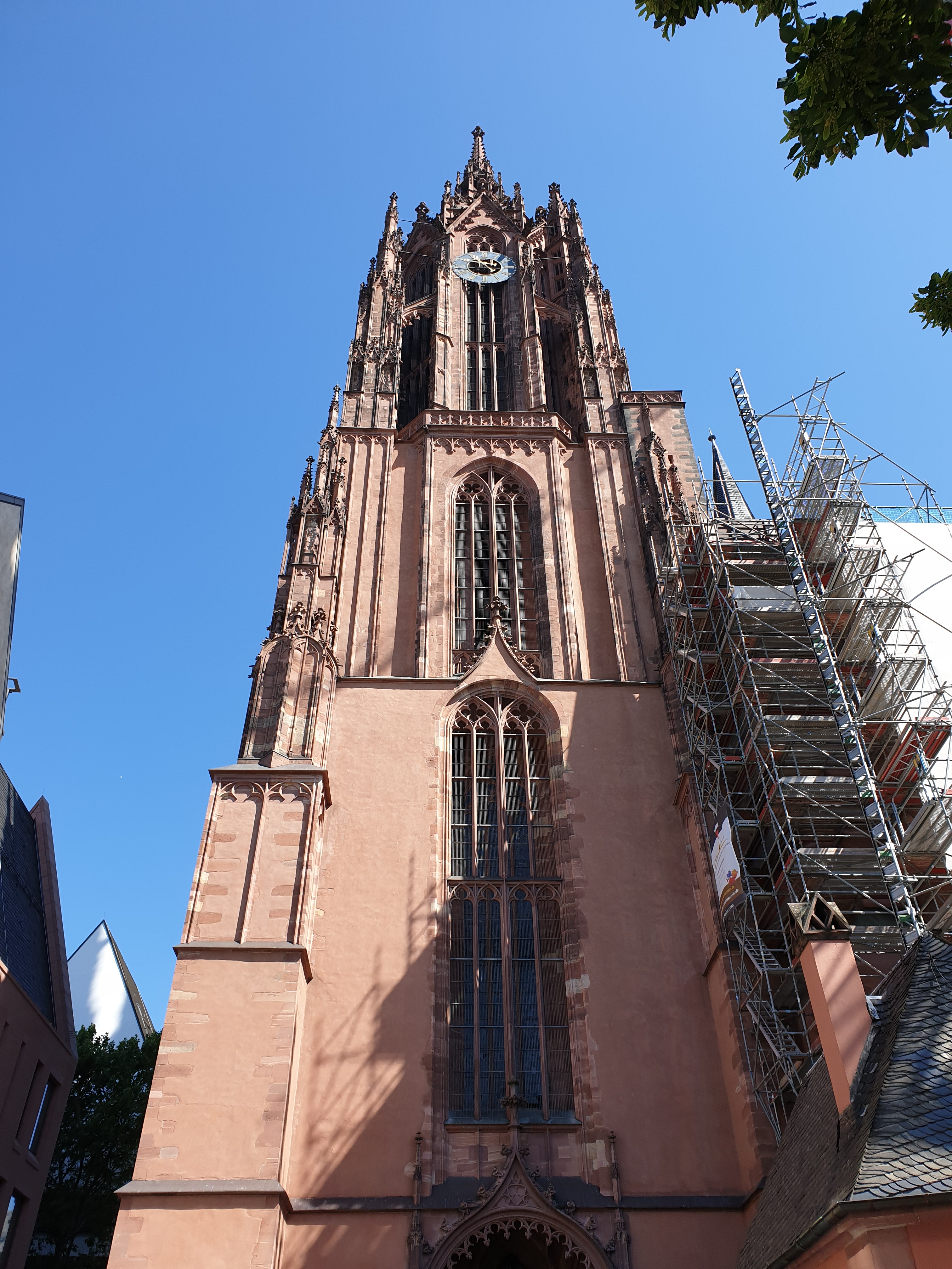 Pandangan ke arah deretan gedung antik di sisi timur Römerberg, Ostzeile menjadi terhalang scaffolding ini. Niat untuk mengambil foto deretan gedung Ostzeile dari depan terpaksa dialihkan dengan mengambil foto dari samping. Di kawasan Römerberg ini juga ada gereja kecil, Alte Nikolaikirche.