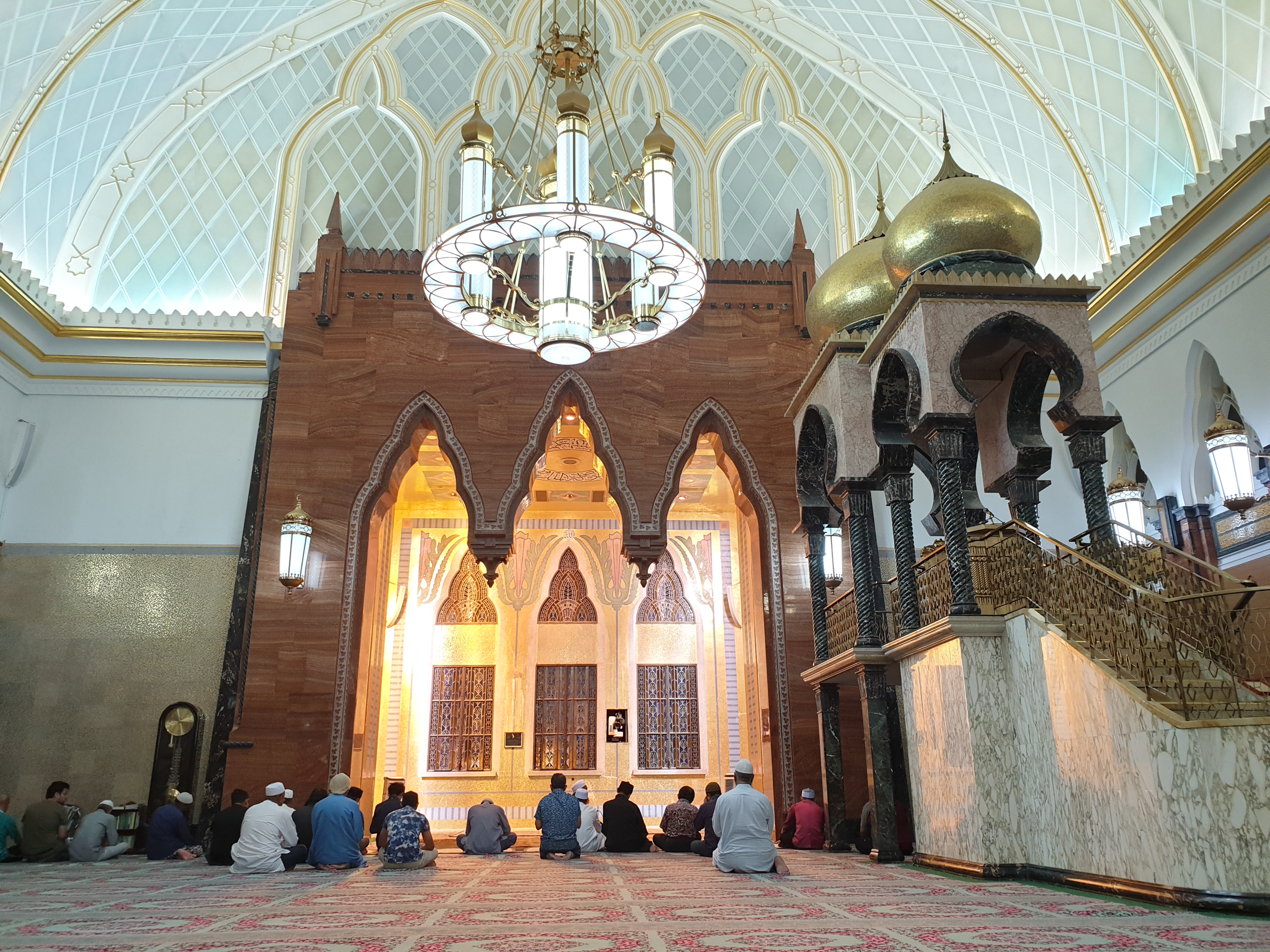 Saat waktu shalat maghrib, saya ikut shalat berjamaah di masjid ini. Jamaah yang shalat disini tidak banyak, hanya 3 shaf terisi, itupun sudah termasuk beberapa wisatawan seperti saya. Interior masjid Omar ini cantik, dengan lampu chandelier kristal dibawah kubah masjid. Mimbar untuk khatib berada di sisi kanan, sementara bagian belakang dijadikan tempat untuk ceramah, lengkap dengan fasilitas layar dan proyektor.