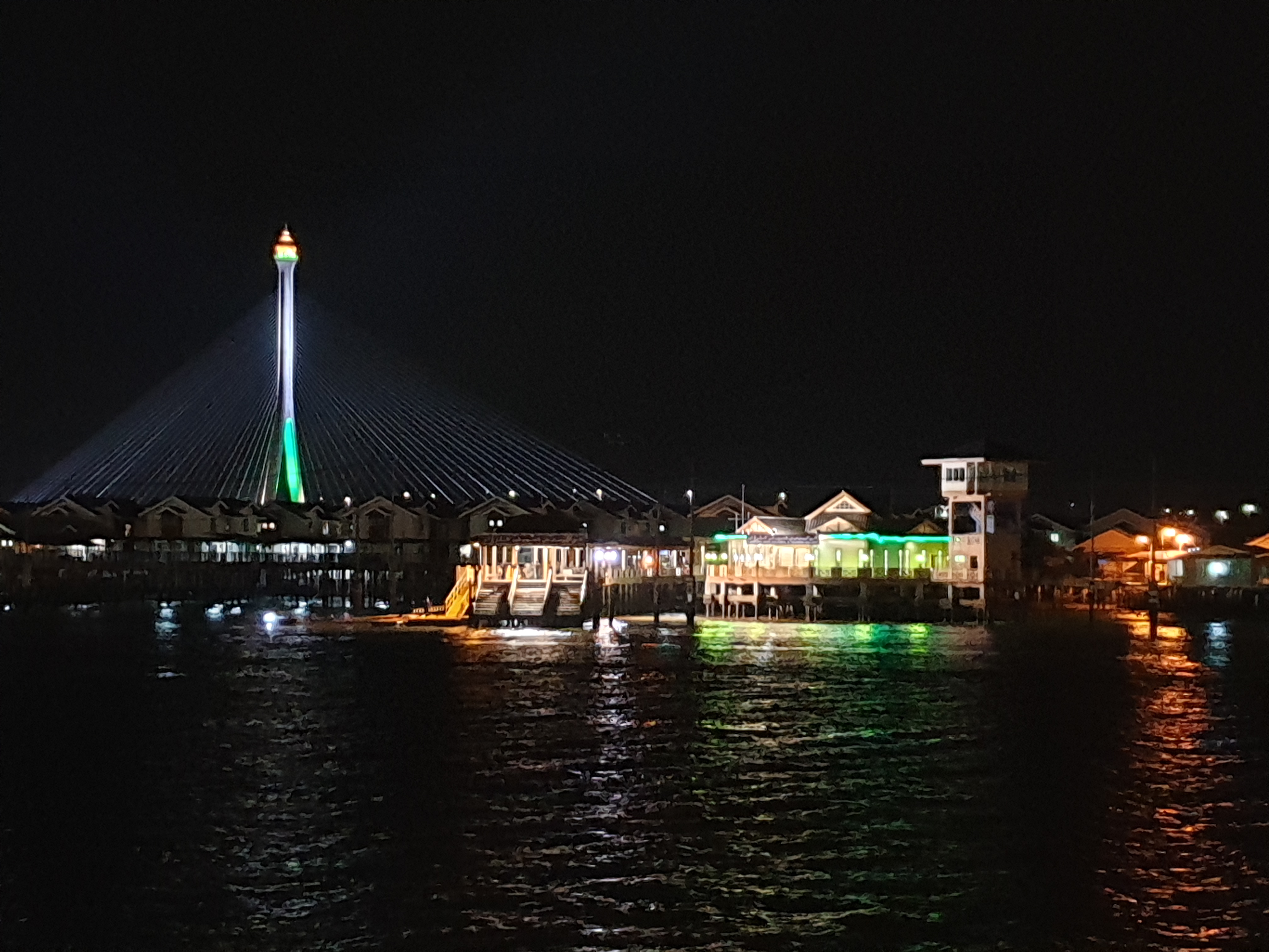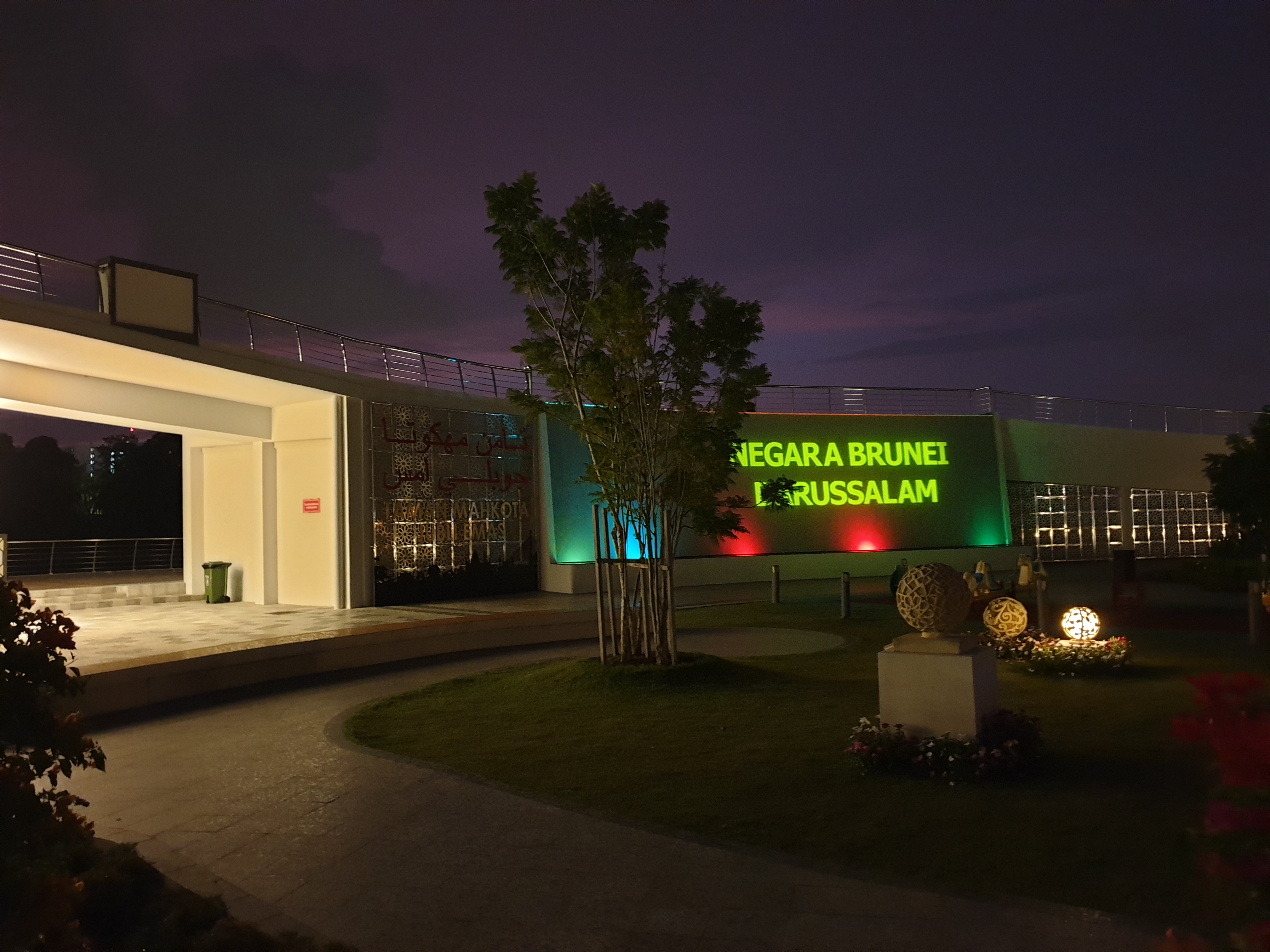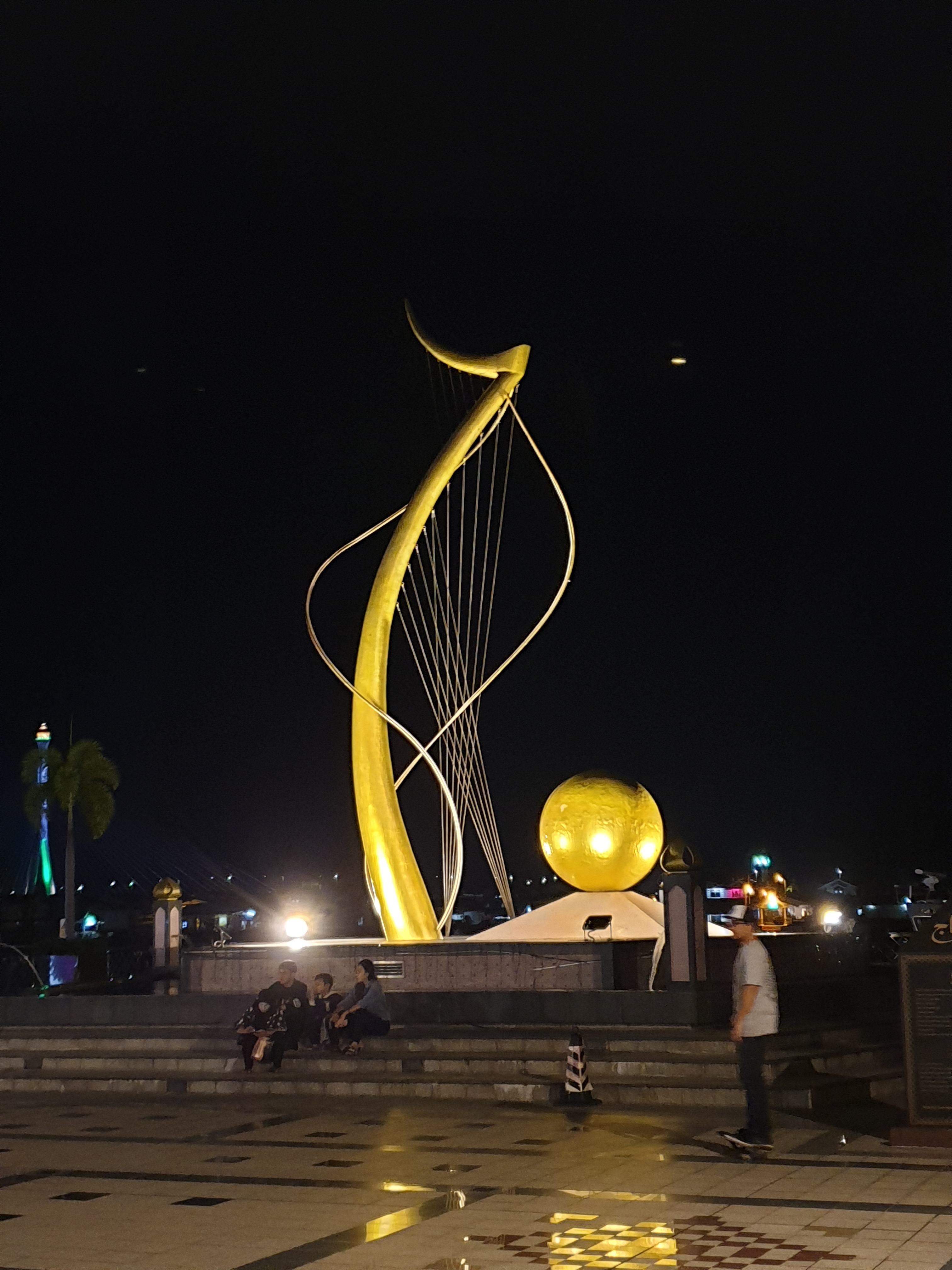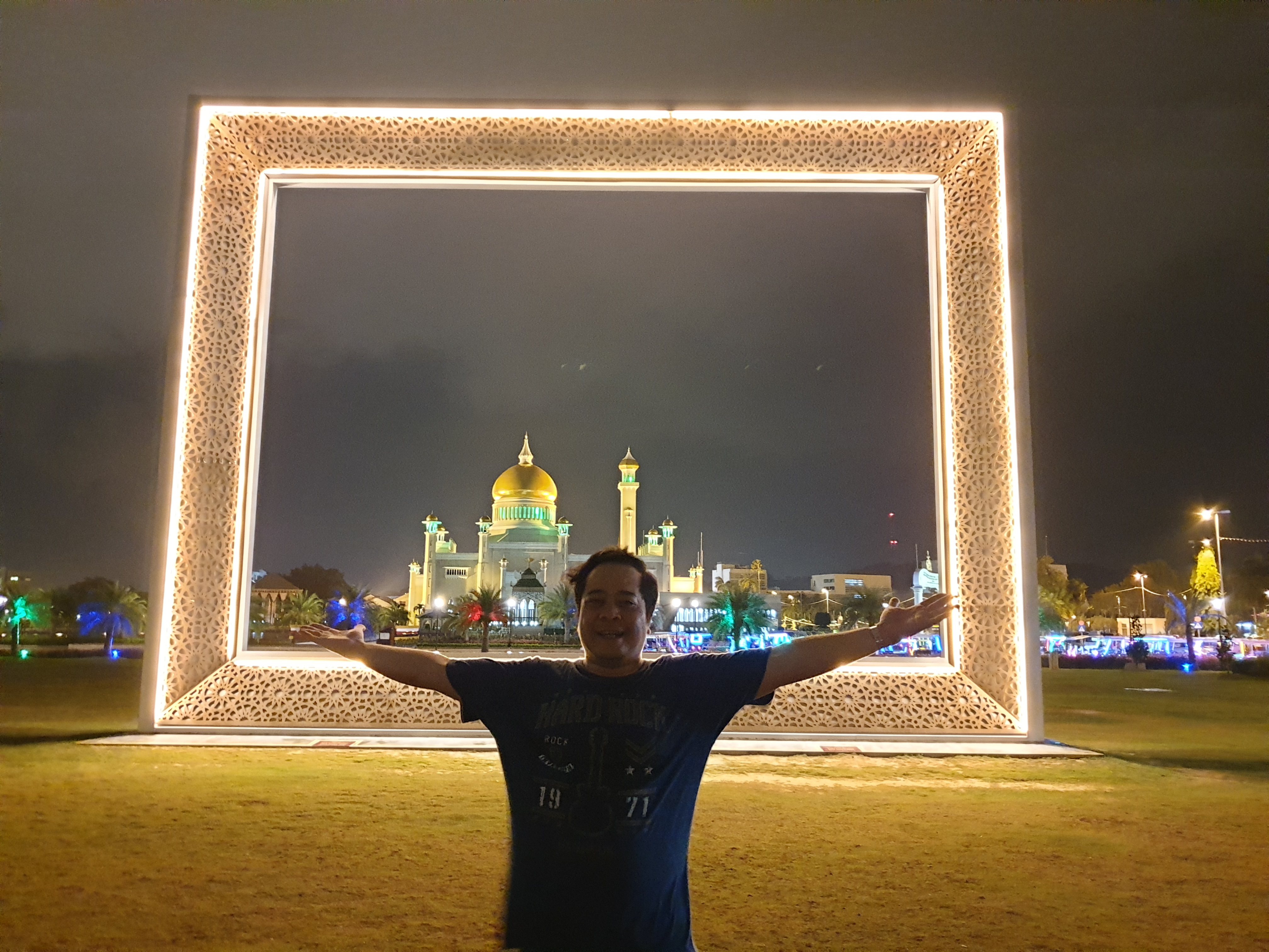 Selesai shalat maghrib, saya berkeliling sekitar kawasan masjid. Di depan masjid ini ada kolam besar dengan monumen perahu tradisional. Di sisi barat, ada taman Mahkota Jubli Emas, disini banyak warga yang datang piknik dengan membawa bekal makan dan tikar. Taman ini berbatasan dengan sungai Brunei, sungai besar yang membelah kota BSB.