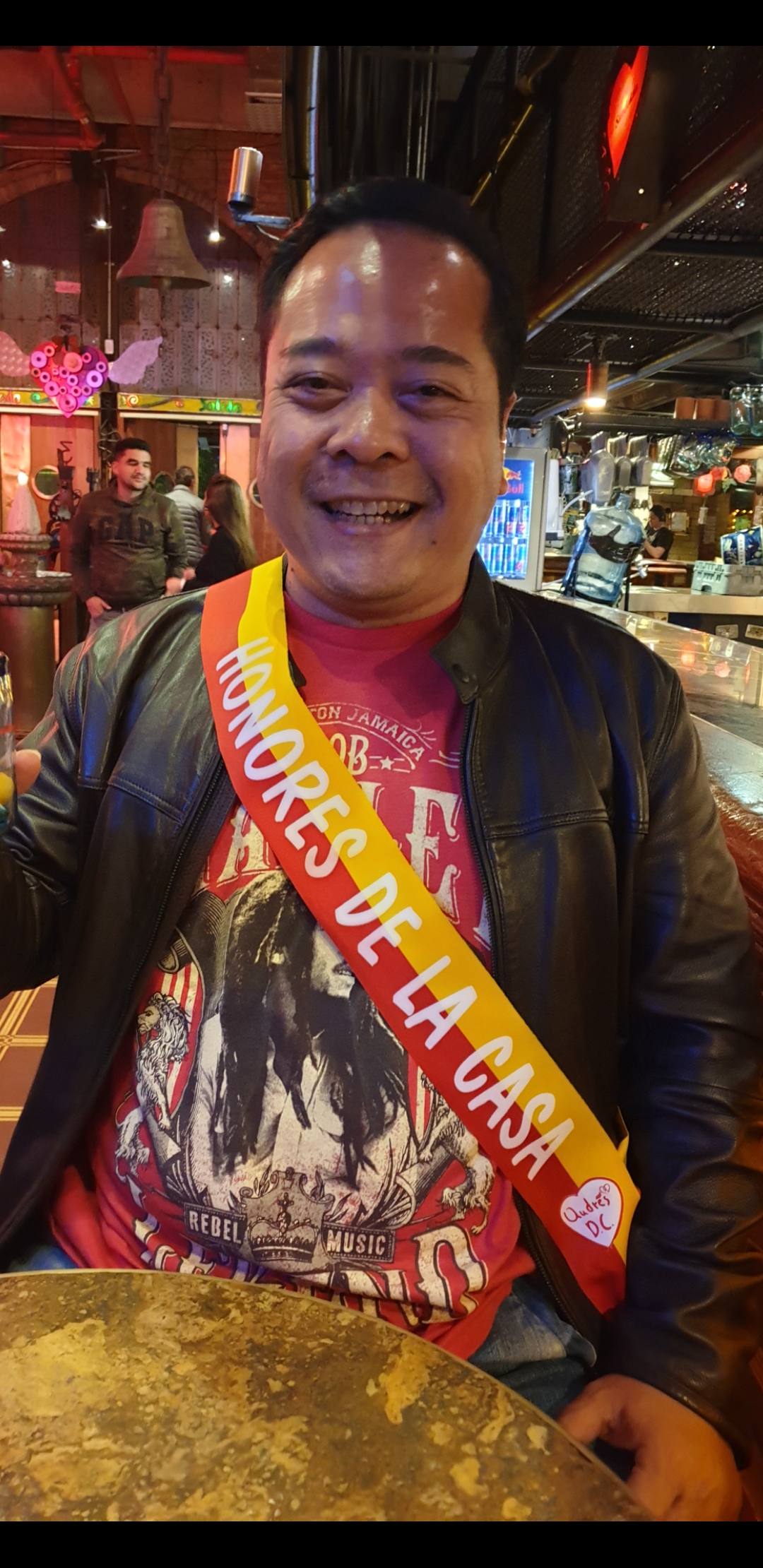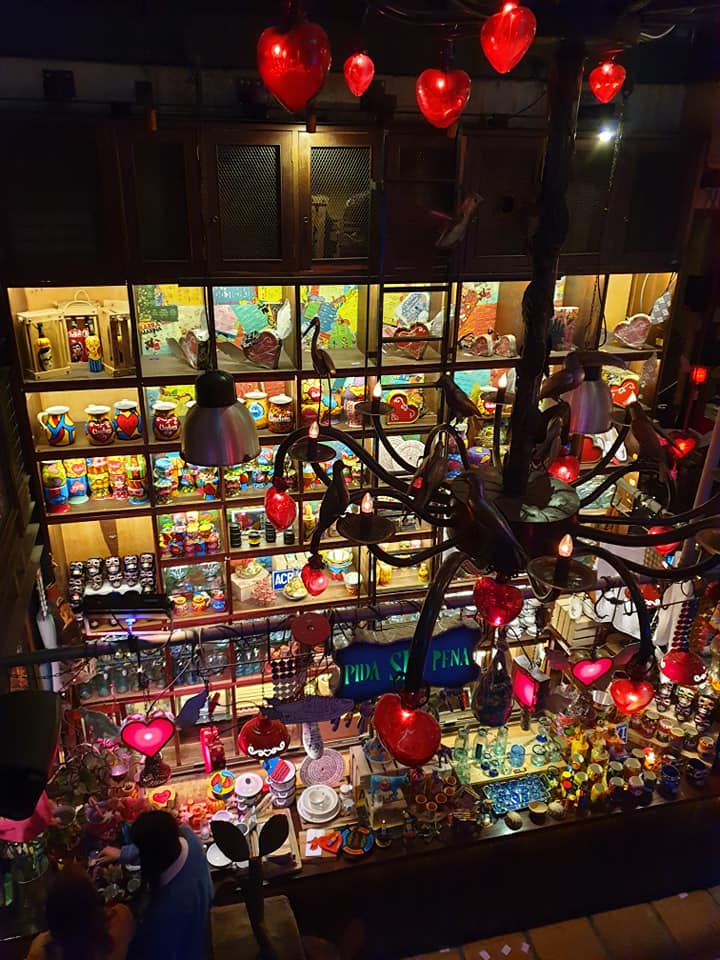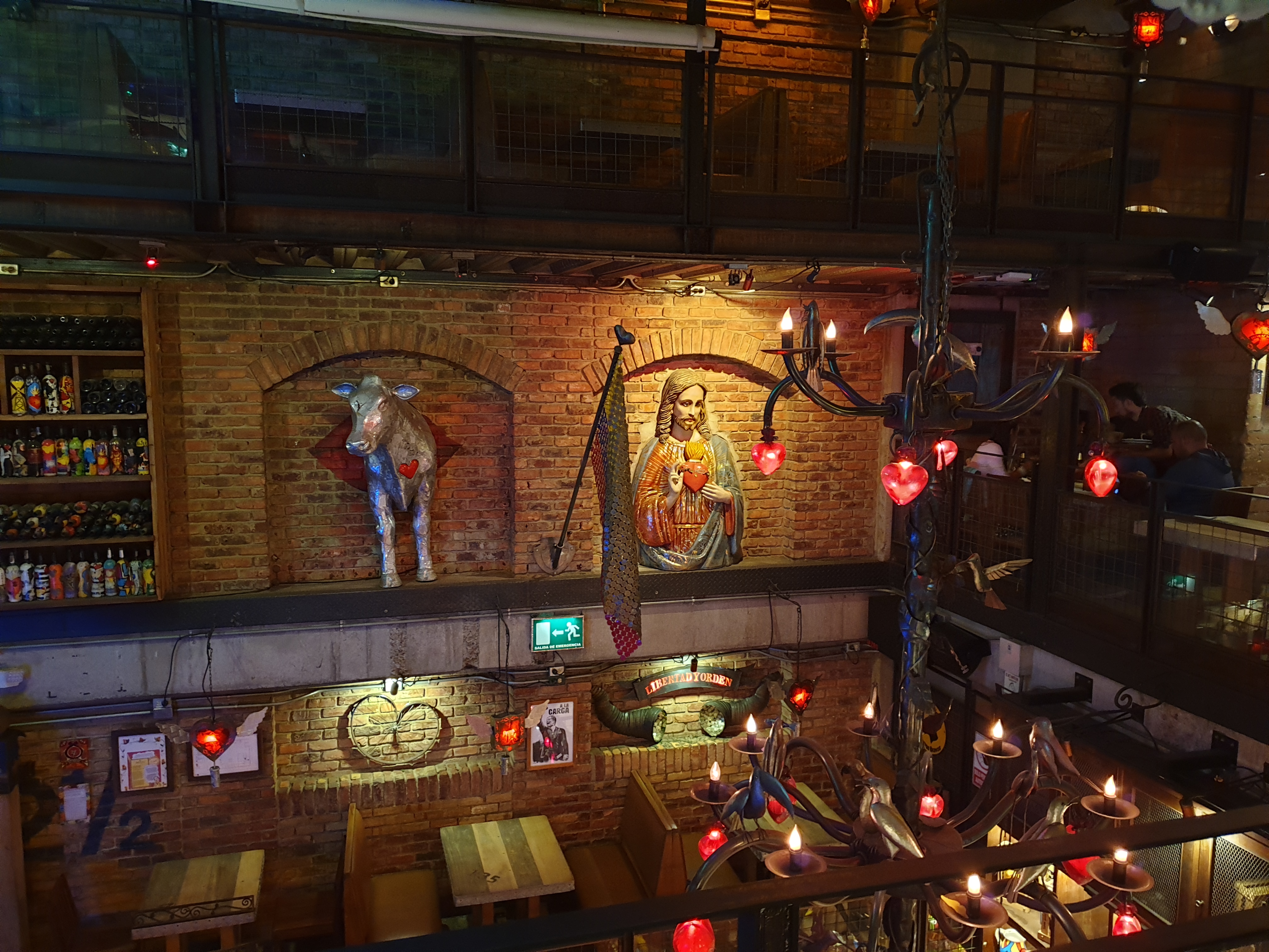 Turis asing seperti saya akan disematkan selempang, yang artinya kurang lebih.. senang anda hadir disini.. malam itu suasana cafe ramai, meja-meja terisi penuh, tapi temen saya bilang, kalau weekend tamu sampai berdiri diantara meja-meja. Uniknya, meski cafe dan bar ini begitu hingar-bingar dan banyak pengunjung yang minum dan mabuk-mabukan, berbagai ornamen religius juga banyak menghiasi dinding di cafe ini.. 😇