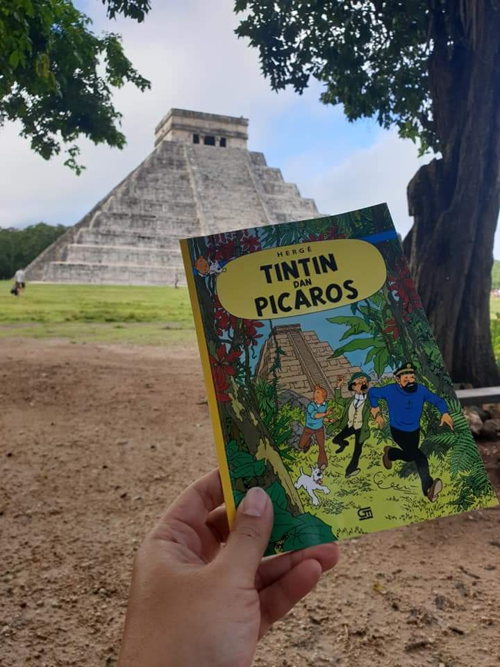 Ada 2 motivasi saya mengunjungi Chichen Itza. Pertama, Mayan temple di Chichen Itza ini digambarkan dalam cover dan isi komik Tintin and The Picaros. Meski dalam komik disebut lokasinya di negara fiktif San Theodoros, namun Herge mengambil gambar-gambar Mayan temples ini dari situs Chichen Itza di Mexico.