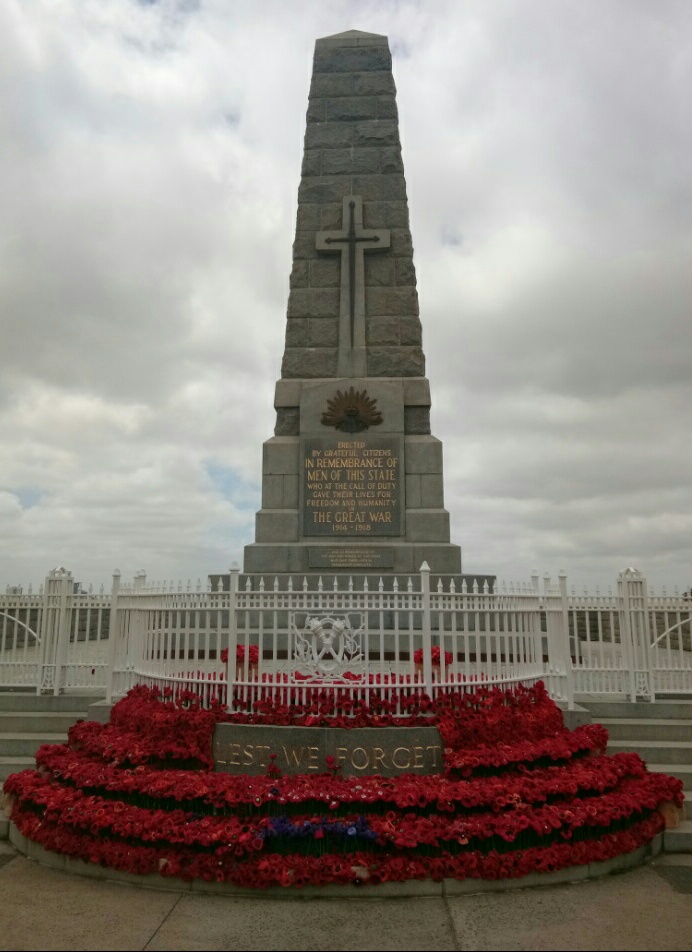 Memasuki taman kita akan disambut dengan teduhnya pepohonan Eukaliptus nan tinggi di kiri kanan jalan, di kejauhan tampak tugu State War Memorial berdiri dengan megah di tengah tengah lapangan yang hijau oleh rerumputan terawat apik dan bersih. Disambut oleh bunga berwarna merah , yang melingkari tugu dan dikurung oleh rumputan hijau tertata rapi di dinding tertulis kata kata puitis “Lets We Forget” (jangan sampai kita lupa). Saat berkunjung sedang dilaksanakan upacara “Remembrance Day” yaitu peringatan yang setiap tahun diadakan pada tanggal 11 Nopember oleh Negara Negara Persemakmuran termasuk Australia sejak akhir Perang Dunia I untuk mengingat para anggota angkatan bersenjata yang gugur di medan perang, banyak veteran hadir pada acara tersebut dan uniknya seorang veteran memainkan alat musik Bagpipe yang suaranya terdengar merdu mendayu hingga jauh.