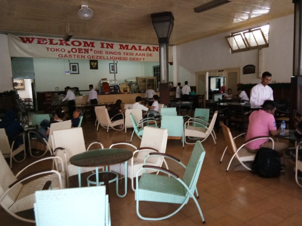 Toko Oen tetap mempertahankan ciri bangunan tua serta sajian masa lalunya lihat saja dalam daftar menu, tersedia cookies khas Belanda seperti kattetonge (lidah kucing) serta kaastengel (batang keju) lalu eskrim andalan Oen Spesial serta makanan utama steik lidah, wienerschitzel dll. Selain itu urusan kuliner lokal-pun tidak kalah beraneka ragam dijumpai sebut saja nasi rawon Tessy, kue lumpur bakar khas sidoarjo, tahu telor “ria” timur Alun Alun, tahu campur Telkom “pak Sukir” hingga mie bakso “President” yang berlokasi fantastis bersebelahan rel kereta api aktif.