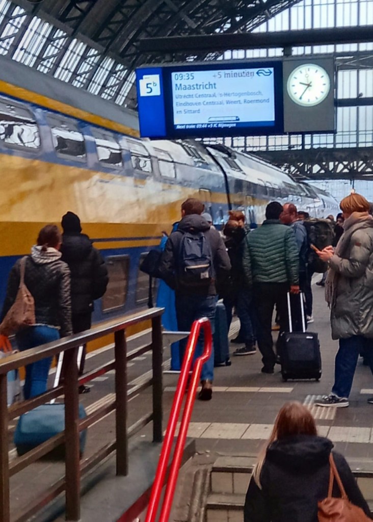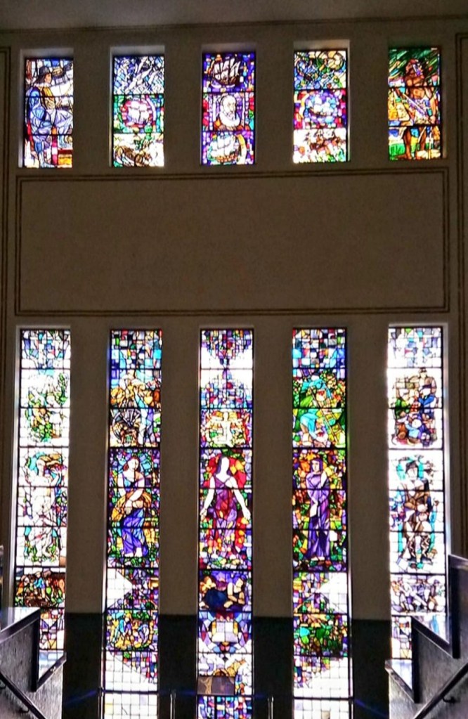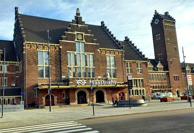 Stasiun Maastricht, bangunan bersejarah tahun 1913 disain bangunan dibuat oleh George van Heukelom. Stasiun selain menghubungkan kota-kota di Belanda juga sebagai stasiun internasional yang menghubungkan Belanda dengan beberapa negara tetangga. Artefak bersejarah yang dapat ditemui saat transit di stasiun antara lain kaca patri yang berada di aula. Dibanding dengan kaca patri yang ditemui di tangga kantor utama Museum Mandiri di Kawasan Oud-Batavia, kaca patri stasiun Maastricht lebih sederhana. Kaca patri Museum Mandiri menggambarkan adanya empat musim di Belanda dan tokoh nakhoda kapal Belanda, Cornelis de Houtman yang mendarat di Banten tahun 1596. Kaca patri Museum Mandiri disumbang Presiden Nederlandsche Handel Maatschappij (NMH) ke 10 CJ. Karl van Aalst atas nama Ratu Kerajaan Belanda.