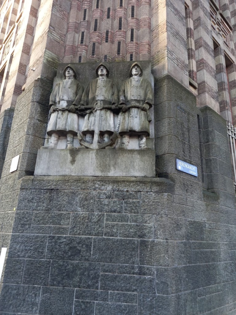 Kami tidak memiliki waktu cukup blusukan ke dalam gedung yang dijuluki “de spekkoek” (kue berlapis) itu, tapi dari luarpun banyak yang dapat digali selain patung-patung di atas. Pintu masuk utama diapit oleh 2 patung sosok wanita. Mata merunduk, kedua tangan terlipat sopan di dada dan bibir mengerucut disebut sebagai Insulinde. Multatuli atau Edward Douwes Dekker memberi nama Insulinde pada Hindia Belanda. Dalam Bahasa latin “Insulin” berarti pulau dan “Indie” untuk India, yang menjadikan Insulinde berarti Kepulauan India, patung mewakili sosok Asia, sedang patung sebelah kanan mewakili sosok Eropa. Di dua sudut jalan terpasang 2 relief menggambarkan pelayaran, perdagangan dan industry. Relief pertama tiga pelaut memegang tambang rantai jangkar serta jangkar. Pada sudut lain dua pria bersepakat dengan berjabat tangan disaksikan orang ketiga.