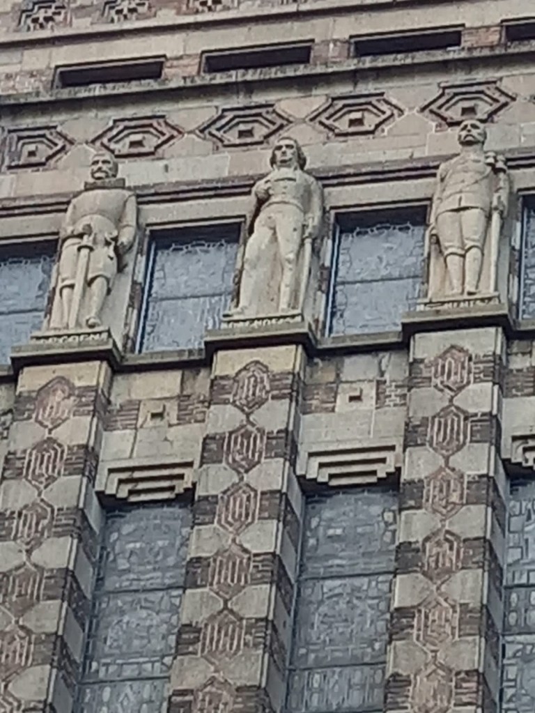 Sebelum menceritakan 3 patung tersebut, bangunan gedung itu sendiri menyimpan catatan sejarah yang tidak kalah panjang. Dibangun dengan gaya yang disebut “brick expressionism”, arsitek Karel de Bazel merancang gedung untuk kantor pusat Nederlandshe Handel Maatschappij (NHM). Di Batavia, kantor NHM sekarang digunakan sebagai Museum Mandiri yang terkenal dengan eksotisme kaca patrinya. NHM merupakan perusahaan dagang Belanda yang menggantikan VOC (Vereenigde Oostindische Compagnie) yang bangkrut akibat korupsi yang dilakukan oleh pejabat VOC sendiri. Kelak NHM merupakan cikal bakal terbentuknya ABN Amro Bank yang merupakan bank terbesar ketiga di Belanda.