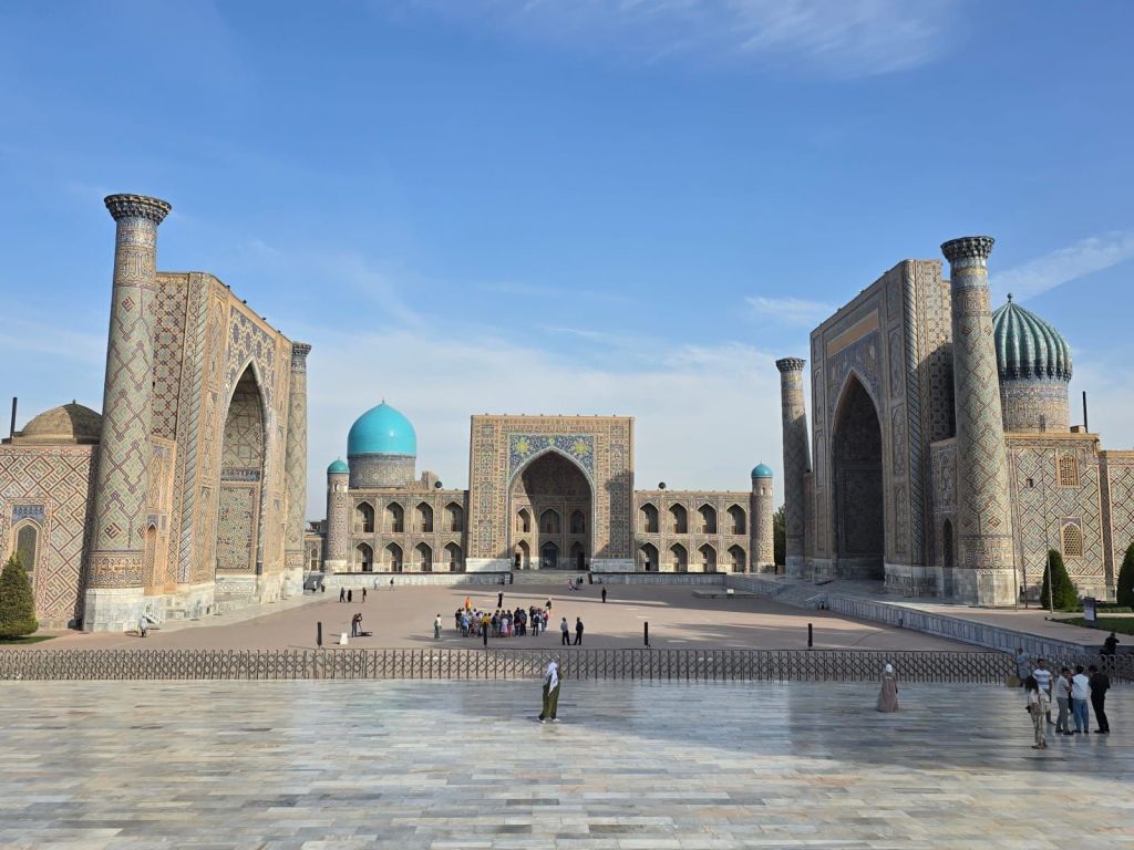 Hari ketiga kami di Uzbekistan, Jumat 11 Oktober, diawali dengan sarapan di Al Madina hotel. Sekitar jam 9 pagi, kami mengunjungi Registan Square, jantung kota tua Samarkand dan merupakan salah satu situs paling ikonik di Asia Tengah. Saat kami tiba, Registan Square masih cukup sepi, belum banyak rombongan turis yang tiba. Nama “Registan” berarti “tempat berpasir” atau “padang pasir” dalam bahasa Persia. Registan Square sejatinya adalah kompleks sekolah (madrasah) yang selama berabad-abad menjadi pusat pendidikan terbaik di Asia Tengah.