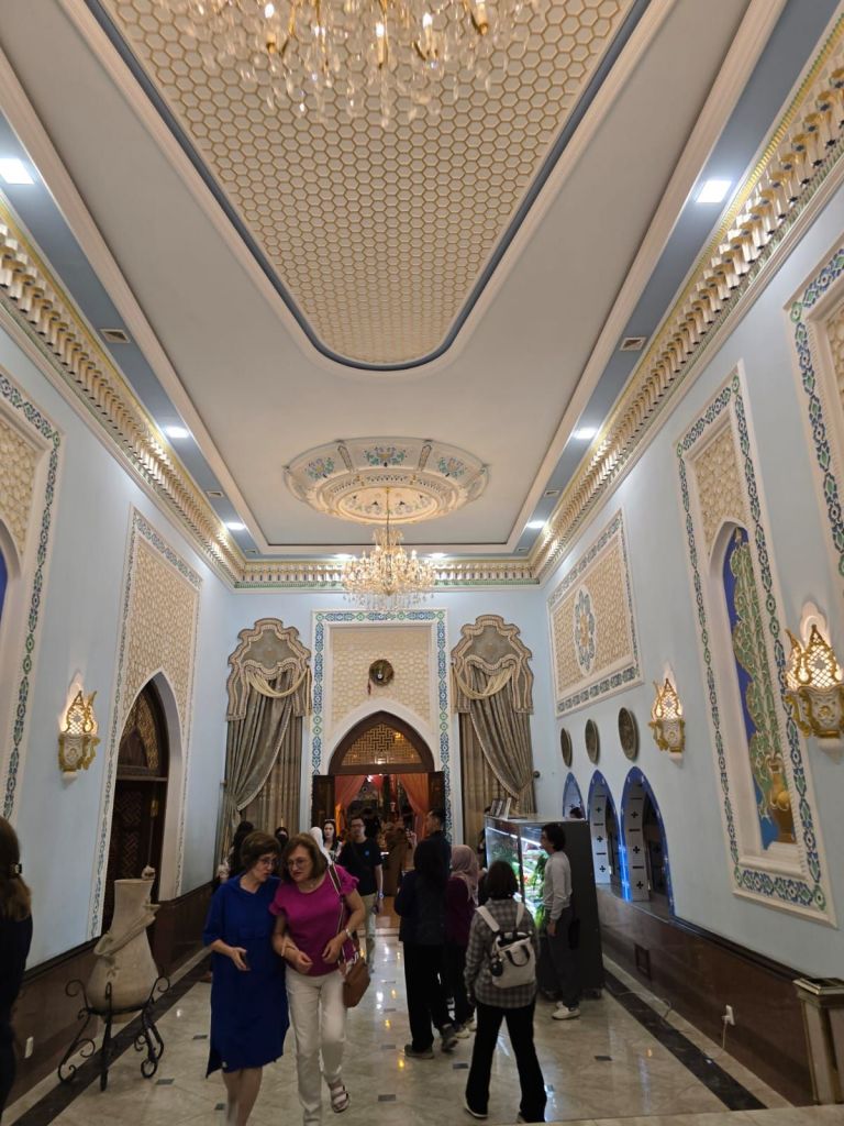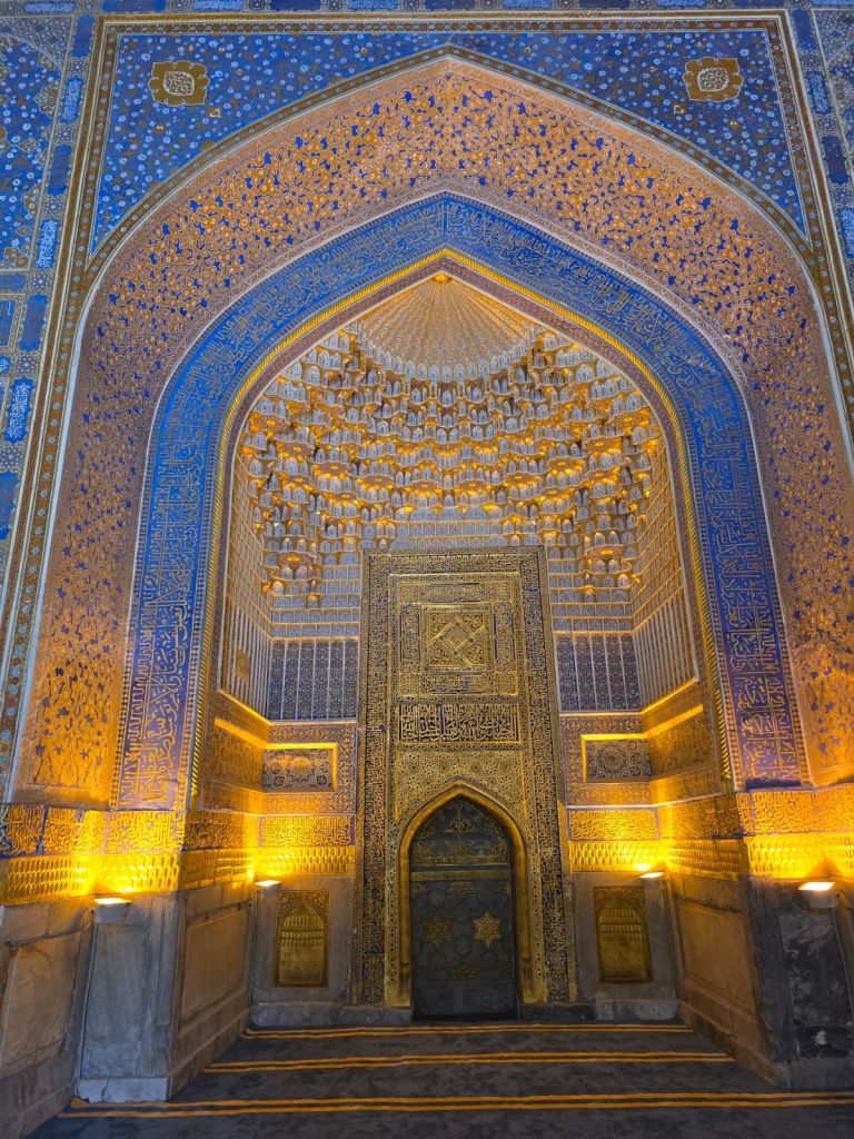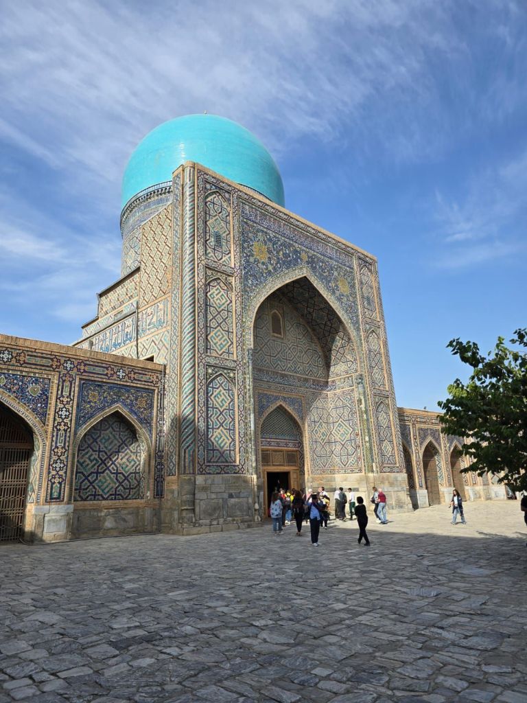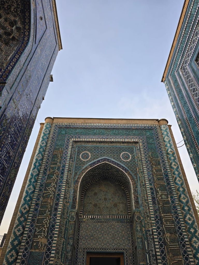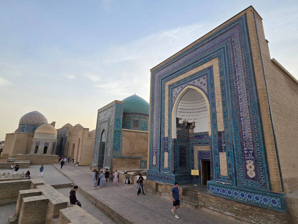Kami makan siang di dekat Siyob Bazaar, di restoran Afro Siyob, menunya, apalagi kalau bukan Plov dan Sashlik 😅. Selanjutnya kami mengunjungi kompleks pemakaman Shah I Zinda. Nama “Shah I Zinda” berarti “Raja yang Hidup” dalam bahasa Persia, yang merujuk pada Qutham ibnu Abbas, sepupu Nabi Muhammad SAW, yang dimakamkan di sini. Kompleks ini terdiri dari lebih dari dua puluh bangunan yang dibangun antara abad 11 hingga abad 15. Shah I Zinda terkenal dengan arsitektur Timuridnya yang megah, yang mencakup mosaik berwarna-warni, ukiran batu yang rumit, dan kubah-kubah yang indah. Kompleks ini dibagi menjadi tiga bagian utama: bagian bawah, tengah, dan atas, yang dihubungkan oleh lorong-lorong berkubah empat yang disebut chartak.