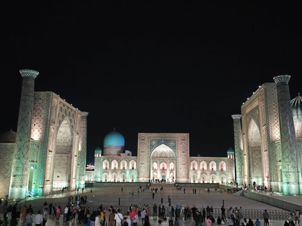 Malam harinya, kami kembali ke Registan Square untuk menikmati pemandangan yang berbeda dari siang hari. Di malam hari, Regiatan Square bermandikan cahaya dari lampu-lampu yang ditata dengan indah, memberikan suasana yang memberi kesan sangat megah. Setelah makan malam di restoran di sebrang Registan Square, kami kembali ke hotel Al Madina, bersiap untuk melanjutkan perjalanan kami ke Kyrgyzstan.