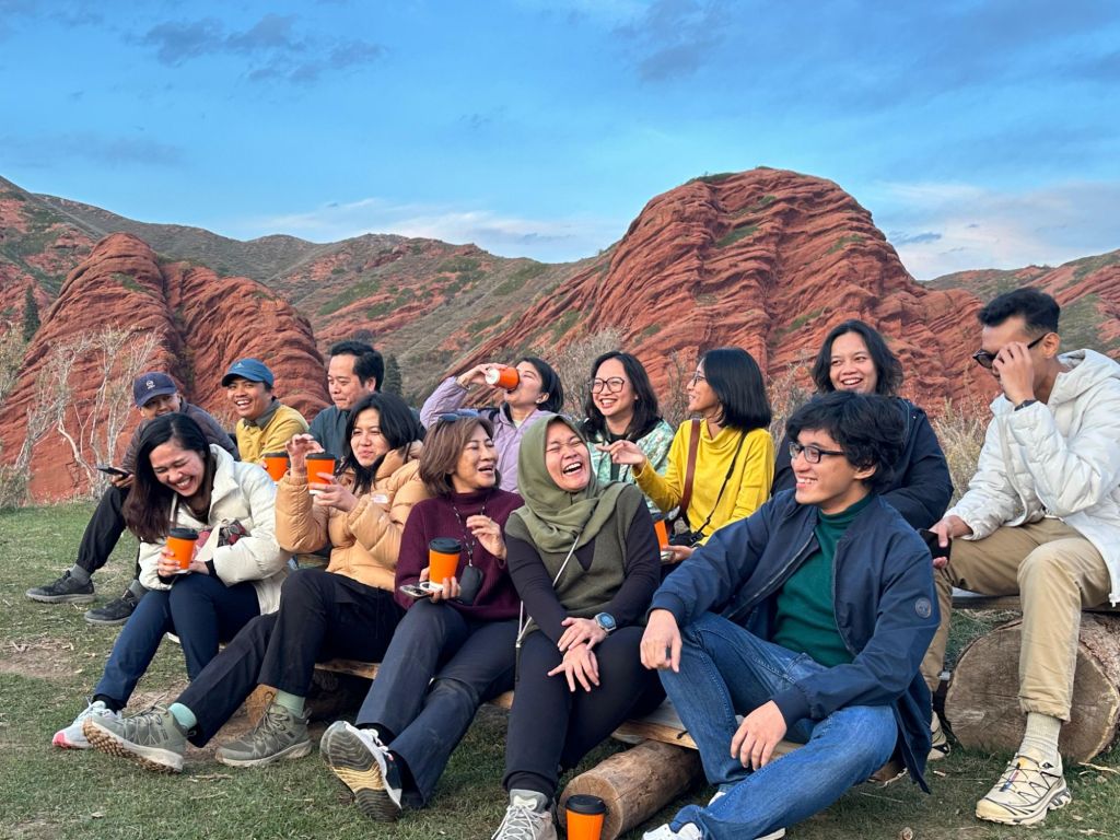 Dekat danau Issyk Kul ini terdapat satu perbukitan, Canyon of Forgotten Rivers. Ketinggiannya sekitar 200 meter. Kami hiking ke bukit ini, perlu waktu sekitar 30 menit dengan nafas ngos-ngosan untuk mendakinya 😅. Sampai di puncak bukit, rasa lelah terbayar lunas dengan pemandangan 360 derajat yang sangat indah. Kita bisa melihat pemandangan danau Issyk Kul di arah utara dan pegunungan Tian Shan di arah selatan. Perbukitan ini bentuknya cukup unik seperti berkerut-kerut, ribuan tahun lalu, perbukitan ini merupakan alur sungai yang mengalir ke danau Issyk Kul. Menjelang matahari terbenam, kami turun dari Canyon of Forgotten Rivers, dan selanjutnya menuju Beltam Yurt camp, tempat kami menginap malam ini.