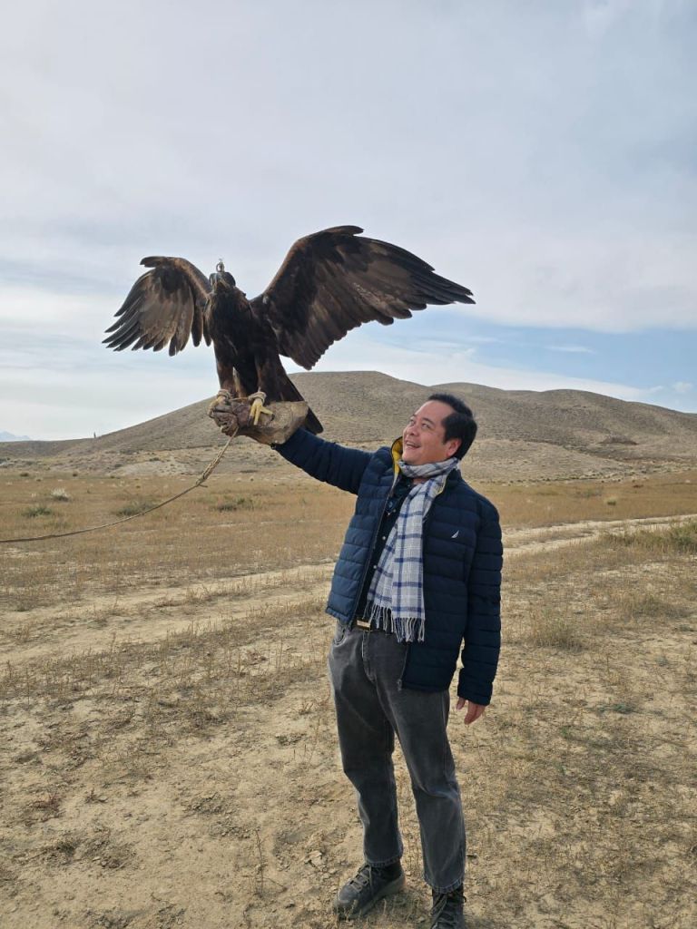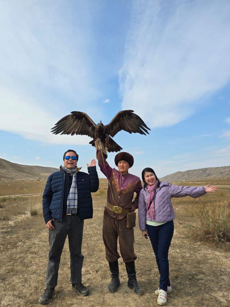 Hari Senin pagi, 14 Oktober, setelah sarapan kami melanjutkan perjalanan ke desa Tong, untuk melihat pertunjukan Eagle Hunter. Sebagian warga Kyrgyzstan dikenal dengan keahliannya melatih burung elang dan anjing untuk berburu. Dengan menggunakan pakaian tradisional Kyrgyzstan, dua pemuda kakak beradik mendemonstrasikan bagaimana elang yang mereka latih, dapat melihat manekin hewan buruan dari atas bukit dan terbang dengan cepat menangkap mangsa. Setelah itu, mereka juga mendemonstrasikan anjing pemburu yang mengejar dan menerkam manekin hewan buruan yang ditarik oleh kuda. Setelah demonstrasi selesai, satu persatu peserta tour diberikan kesempatan berfoto dengan elang pemburu hinggap di tangan, tentunya dengan sarung tangan kulit tebal untuk melindungi tangan dari cakar elang yang tajam.