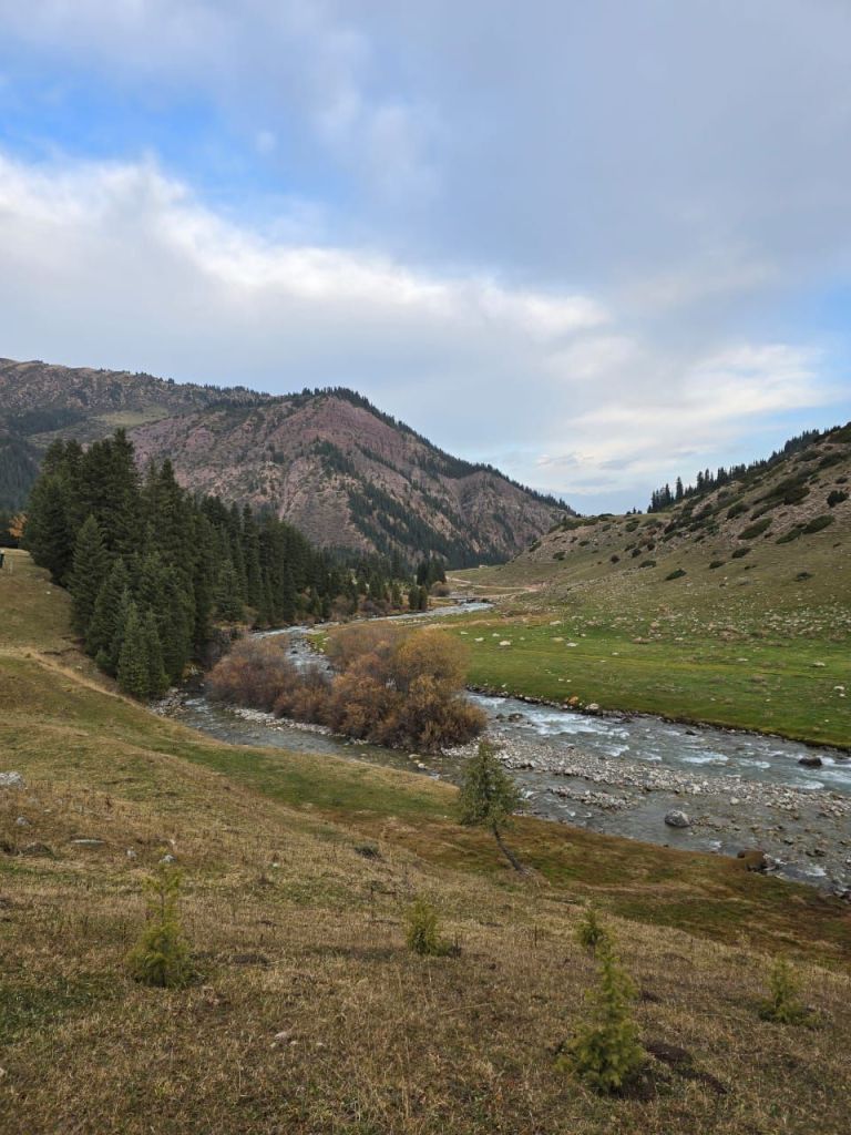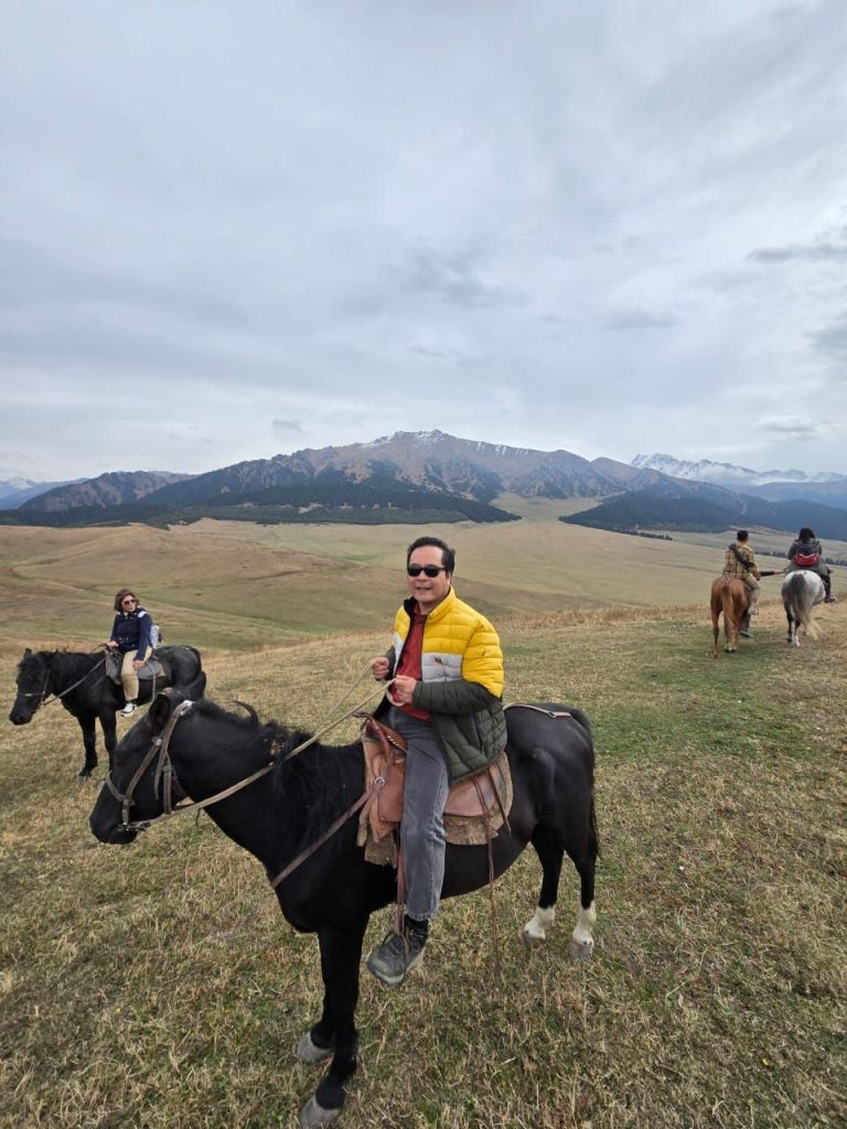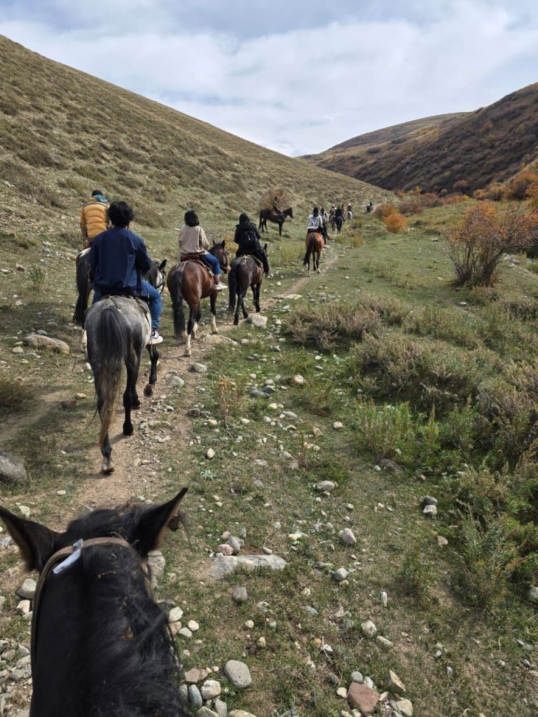 Hari ke 7 di Asia Tengah, Selasa 15 Oktober, kami meninggalkan Golden Yurt camp menuju Karakol. Petualangan hari ini adalah menunggang kuda ke Karakol valley. Dari titik pemberangkatan di Karakol, peserta tour diajari cara mengendarai kuda supaya baik jalannya 😁. Perjalanan ke Karakol valley dengan kuda ditempuh selama sekitar 1,5 jam. Sialnya, saya kebagian kuda yang setiap sebentar berhenti untuk makan rumput dan ilalang, akibatnya saya tertinggal di belakang rombongan, sampai si kuda berkali-kali dipecut oleh ranger di belakang agar mau jalan lagi. 😅