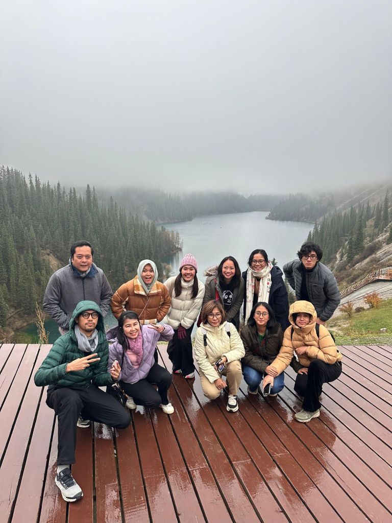 Kami melanjutkan perjalanan ke Saty village. Di desa ini kami akan menginap di guest house milik warga setempat. Tiba di guest house sekitar pukul 15, kami makan siang di guest house. Setelah beristirahat sejenak, kami berangkat menuju Lake Kolsay. Tiba disana sekitar jam 16.15, suasana agak mendung. Kami berfoto dengan latar belakang Lake Kolsay yang masih terlihat jelas.