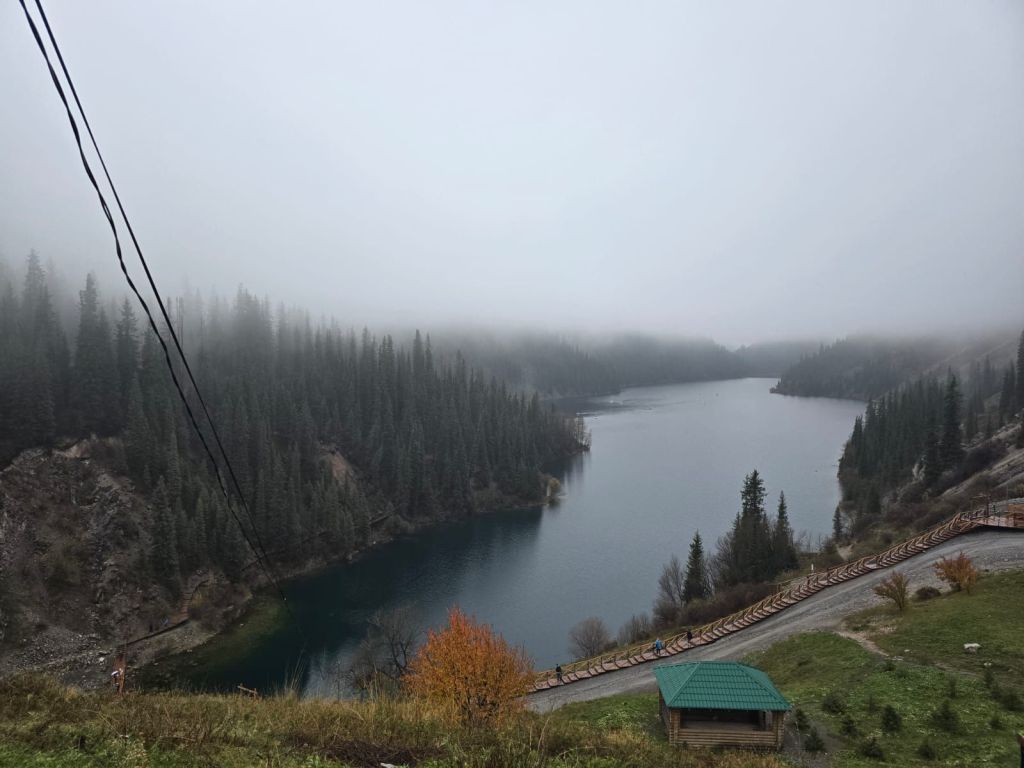 Hanya dalam waktu 10 menit, kabut tebal mulai memenuhi area Lake Kolsay, danau cantik ini tak lagi terlihat dari ketinggian. Kemudian kami diajak turun ke tepi danau, dengan berjalan kaki sekitar 15 menit. Sampai di tepi danau, pemandangan sekitar danau agak terlihat dengan jarak pandang sekitar 10 meter saja. Tak lama hari mulai gelap, lampu-lampu sekitar danau mulai dinyalakan, membuat suasana sekitar danau terasa lebih semarak. Puas berkeliling danau, kami kembali ke guesthouse di Saty village, dan makan malam di guesthouse.