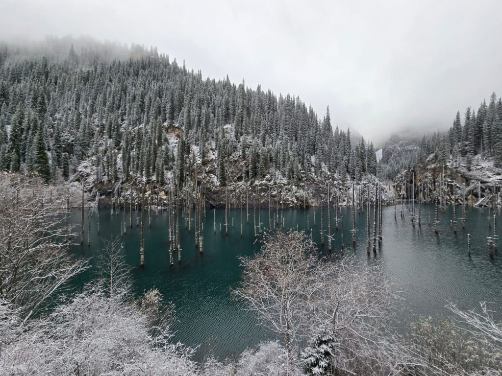 Lake Kaindy terletak di ketinggian sekitar 2000 meter, menjelang tiba di kawasan Lake Kaindy, hutan dan bukit di sekitarnya mulai terlihat putih, imbas dari salju yang mulai turun dari semalam. Cantik sekali pemandangannya. Setelah sekitar 30 menit menempuh perjalanan offroad, mobil van tiba di area parkir Lake Kaindy. Dari area ini pengunjung musti hiking dengan rute yang mendaki. Pohon-pohon pinus sepanjang jalan setapak terlihat memutih diselimuti salju tipis. Setelah hiking selama sekitar 20 menit, kami tiba di tepi Lake Kaindy. Pagi itu kami merupakan pengunjung pertama yang tiba di kawasan Kaindy. Jejak sepatu kami membentuk jalur setapak di lintasan bersalju.