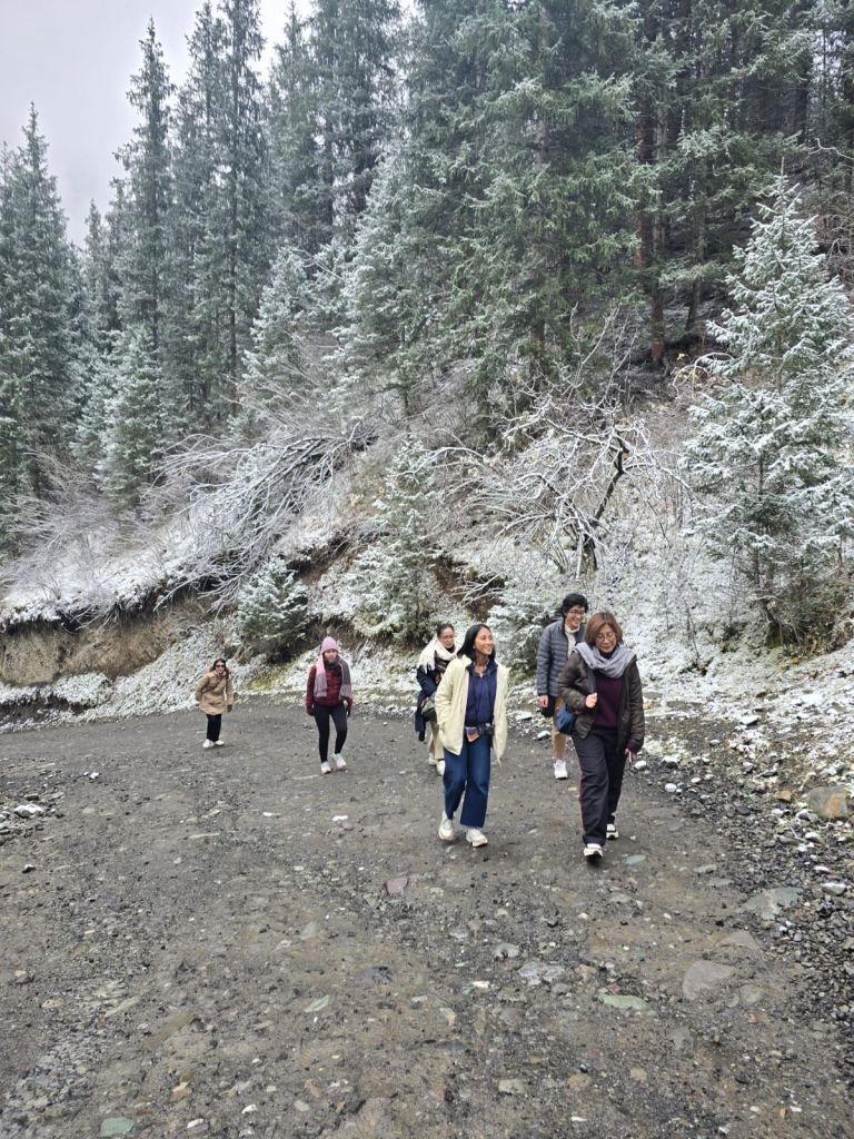 Salju tipis yang menyelimuti vegetasi di sekitar Lake Kaindy pagi itu membuat panorama danau semakin spektakuler. Betah berlama-lama menikmati pemandangan disini. Hampir 2 jam kami mengeksplorasi Lake Kaindy. Sekitar jam 11, kami kembali ke parkiran van, saat jalan turun, kami melihat salju tipis yang tadi pagi menyelimuti jalan setapak, mulai mencair diterpa cahaya matahari siang. Kami kembali ke Saty village guesthouse untuk makan siang dan checkout.