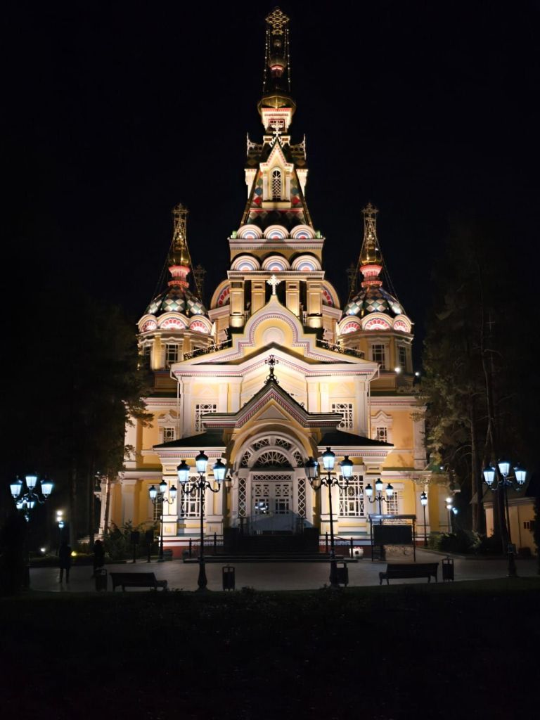 Selesai makan malam, kami menuju Ascencion Cathedral. Gereja kristen ortodox ini merupakan gereja terbesar di Almaty. Fasad luarnya terlihat megah dengan kubah yang mengingatkan pada Gereja Saint Basil di Moscow. Dari gereja ini kami berjalan melihat suasana kota Almaty di malam hari, sebelum kembali ke hotel untuk beristirahat.