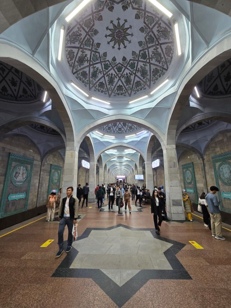 Pagi 18 Oktober, kami sarapan di hotel dan melanjutkan perjalanan ke Bandara Almaty. Pesawat kami bertolak dari Almaty sekitar pukul 11 pagi, dan tiba kembali di Tashkent, Uzbekistan jam 1 siang. Hari ini jadwalnya belanja di Human Souvenir Shop, toko cindera mata eksklusif di Almaty. Puas belanja, kami menuju stasiun subway Kosmonavtlar. Stasiun-stasiun kereta bawah tanah di Tashkent dibangun pada era Uni Sovyet tahun 70an. Karenanya, disainnya mirip dengan subway di Moscow. Setiap stasiun memiliki tema yang berbeda, dan menjadi tujuan wisata yang unik dan fotogenik.