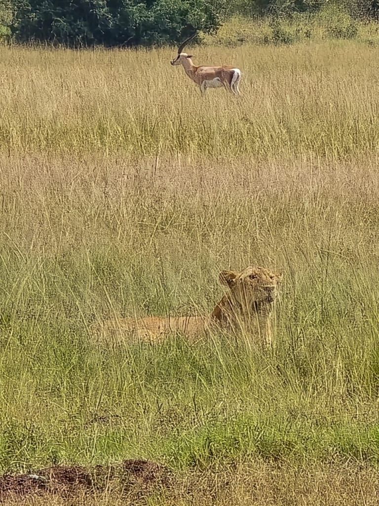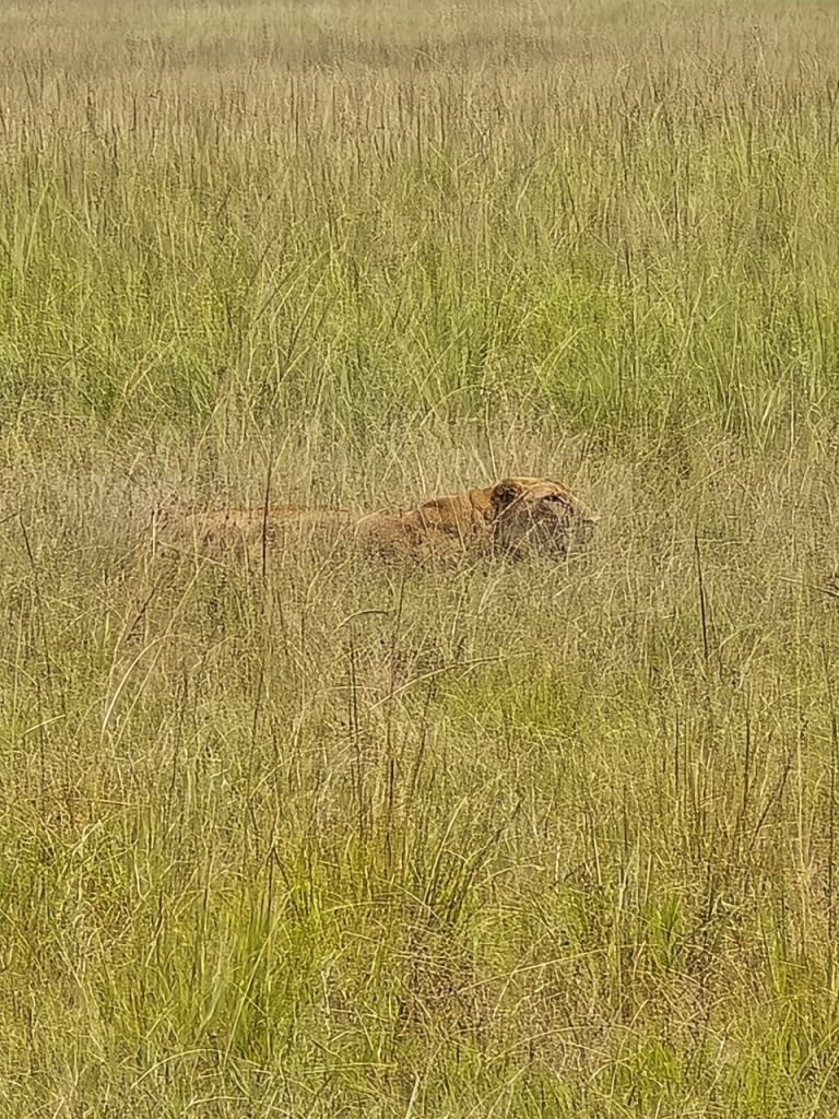 Benar saja, tak lama guide kami memacu jeep menuju satu lokasi. Dari jarak sekitar 200 meter, kami melihat ada seekor singa betina yang sedang merunduk di semak-semak. Singa itu sedang mengintai sekawanan antilop yang sedang merumput disana. Setelah diperhatikan lagi, ternyata singa betina itu tidak sendirian, ada dua ekor singa lain yang terlihat sedang mengintai kawanan antilop.