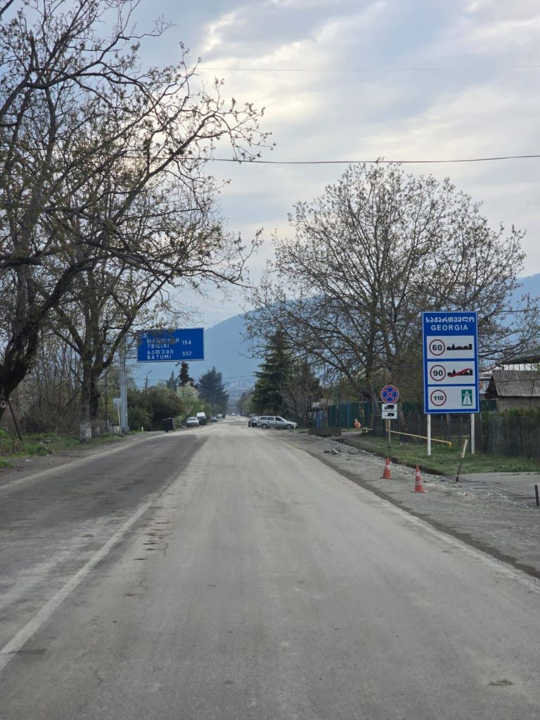 Setelah meninggalkan pos imigrasi Azerbaijan, yang lorongnya sangat panjang dan menanjak dengan banyak anak tangga (cukup merepotkan karena kami membawa koper masing-masing), kami tiba di jembatan yang menghubungkan Azerbaijan dengan Georgia. Di ujung jembatan, pos imigrasi Georgia telah menanti. Kami menyiapkan printout e-visa dan melangkah menuju counter imigrasi, namun langkah kami dihentikan oleh dua orang petugas. Mereka menanyakan kami dari negara mana, tujuan ke Georgia mau apa, apakah sudah ada reservasi hotel dan tiket pesawat pulang, bawa uang berapa, bahkan diminta menunjukkan uang yang dibawa. Setelah pemeriksaan awal dari dua petugas ini barulah kami diizinkan menuju counter imigrasi. Di counter ini kita hanya difoto dan cap paspor saja, tidak ditanya-tanya lagi. Lewat imigrasi dan scanning bagasi, kami disapa oleh seorang pemuda Georgia yang telah menunggu kami. Namanya Gega, pemuda ini yang bertugas menjadi driver dan guide selama perjalanan kami di Georgia dan Armenia.