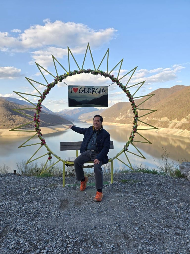 Perjalanan kami lanjut ke arah utara menuju Kazbegi. Di tengah perjalanan, kami berhenti di Panorama Waduk Zhinvali (Zhinvali Reservoir), danau buatan berair biru kehijauan yang dikelilingi perbukitan. Spot ini sangat Instagrammable, disediakan beberapa spot foto berbentuk love dan lingkaran. berbeda dengan di Indonesia dimana kita harus membayar kepada pengelola setempat untuk foto di spot khusus, spot foto yang disediakan di Panorama ini gratis, tidak ada yang nungguin dan mengutip bayaran.