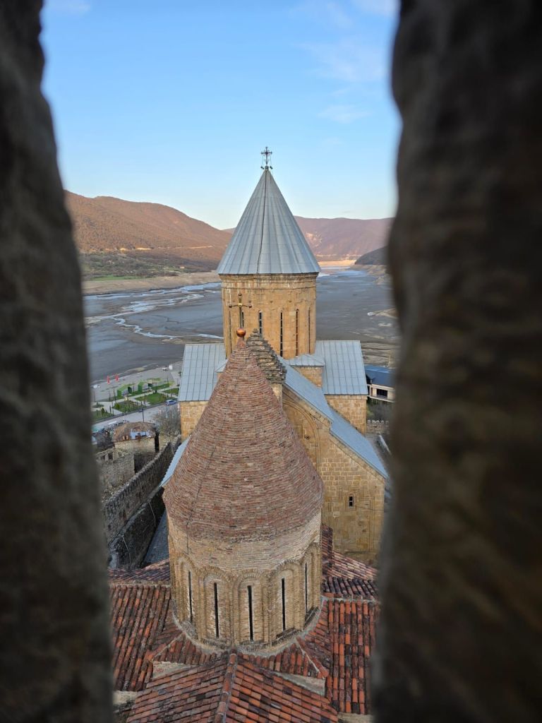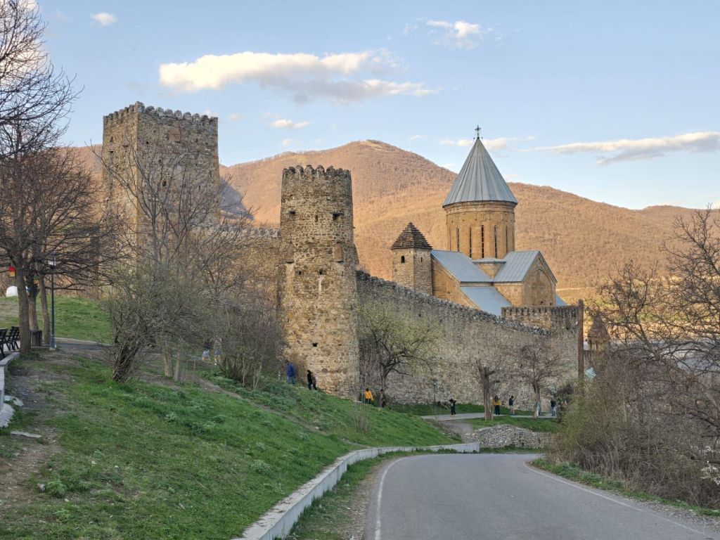 Kami memasukkan barang-barang bawaan kami ke mobil van dan melanjutkan perjalanan darat, begitu masuk ke Georgia sekitar pukul 4.30 sore tanggal 31 Maret 2025, kami langsung disuguhi pemandangan perbukitan hijau dan suasana yang lebih rustic. Meskipun secara ekonomi, pendapatan per kapita Georgia (USD 8.300 tahun 2024) lebih tinggi dari Azerbaijan (USD 7.100 tahun 2024), namun terlihat rumah-rumah dan bangunan di Georgia tidak sebagus di Azerbaijan. Suasana pedesaan yang kami lewati terasa sekali sisa-sisa pengaruh Uni Sovyet / Rusia. Bangunan-bangunan flat yang cenderung seragam dan warna yang cenderung suram. Berbeda dengan Azerbaijan yang 95% penduduknya beragama Islam, Georgia mayoritas penduduknya (sekitar 85%) pemeluk Kristen Orthodox, pemeluk Islam sekitar 10%. Karenanya, sepanjang perjalanan dari perbatasan kami banyak melihat bangunan gereja bergaya Orthodox, seperti yang banyak terdapat di Rusia. Salah satu gereja orthodox yang kami lewati adalah Gremi church, yang terletak diatas bukit. Gereja yang dibangun pada abad 16 ini tampak megah dan cantik.