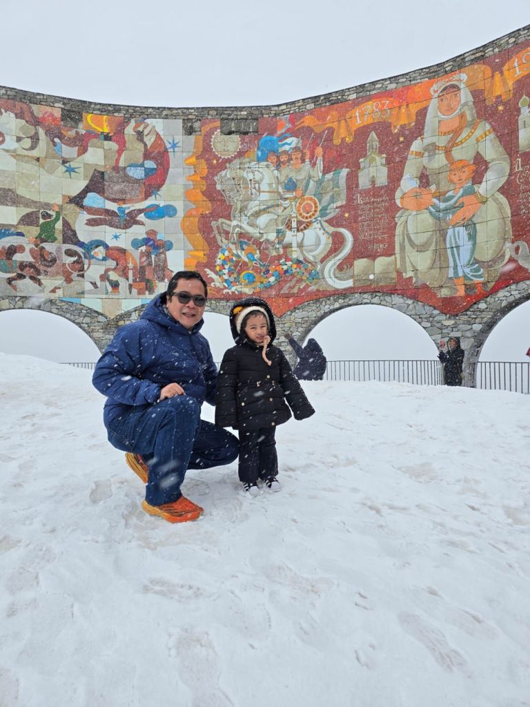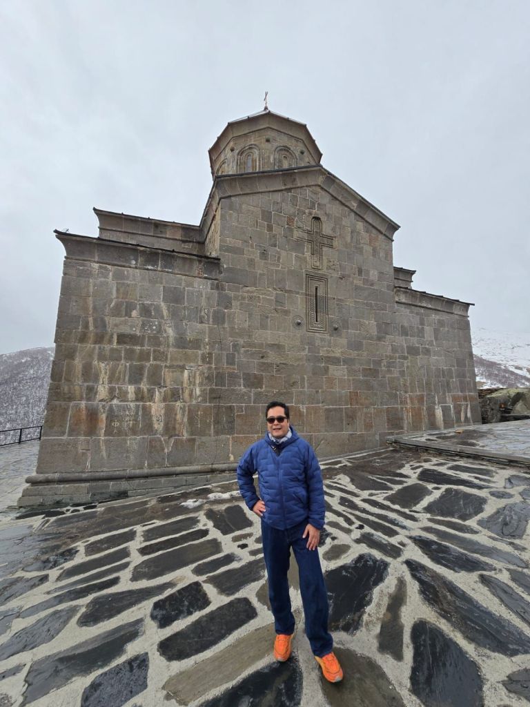 Pagi hari Rabu 2 April 2025, saya mulai dengan jalan santai di Kazbegi sambil menikmati udara dingin dan pemandangan pegunungan yang luar biasa. Lumayan, sambil menunggu waktu sarapan, bisa jalan santai sekitar 3km di sekeliling hotel. Setelah sarapan, kami menuju salah satu landmark Georgia, Gereja Gergeti Trinity (Gergeti Orthodox Church). Gereja ini berdiri megah di atas bukit, dengan latar belakang Gunung Kazbek yang menjulang. Perjalanan naik ke atas bukit cukup menantang, tapi pemandangannya sepadan, terasa magis dan tenang. Menjelang kawasan puncak gunung, dataran kiri dan kanan jalan mulai tertutup salju. Meskipun sudah bulan April, kawasan ini masih diselimuti salju karena posisinya yang cukup tinggi, sekitar 2.200 meter diatas permukaan laut. Ingin rasanya berlama-lama menikmati pemandangan gunung-gunung salju yang mengelilingi gereja ini, namun angin pagi itu cukup kencang dan terasa dingin menusuk. Cucu kami yang belum terbiasa di suhu udara yang sangat dingin, menangis rewel karena merasa tidak nyaman. Kamipun turun dari kawasan puncak Gergeti church dan mengajak cucu bermain salju dibawah yang anginnya tidak terlalu kencang.