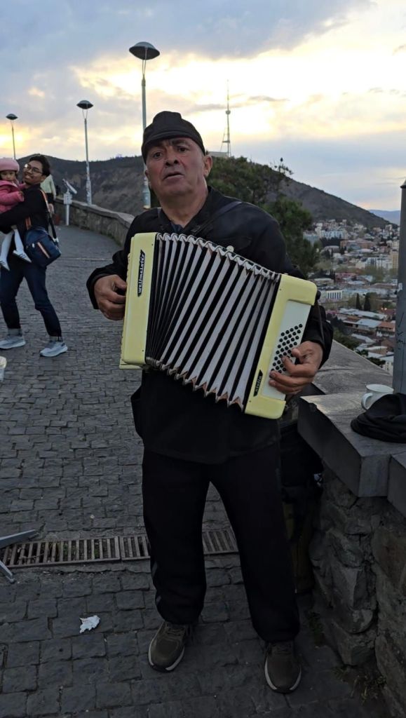 Sore hari kami kembali ke Tbilisi untuk melakukan city tour. Perhentian pertama, kami naik kereta gantung ke Patung Mother of Georgia. Saat keluar dari stasiun cable car, seorang seniman accordion menyapa kami dan bertanya dari mana. Saat kita jawab dari Indonesia, dia langsung memainkan lagu Indonesia Raya dengan accordion nya. Suatu kejutan yang menyenangkan.