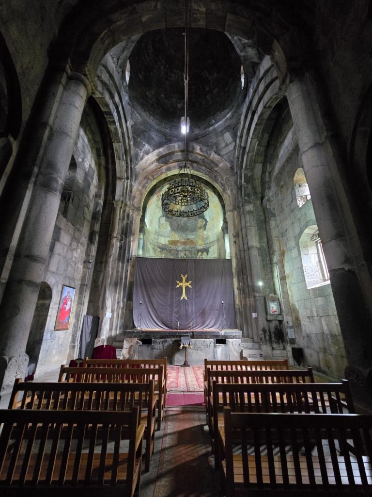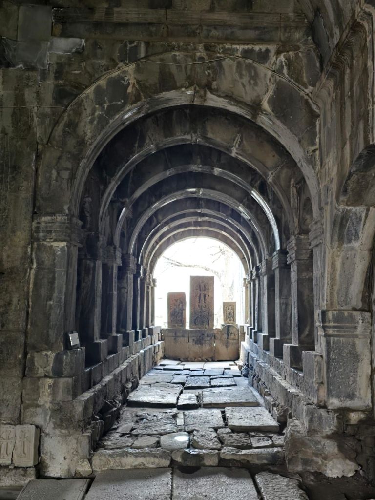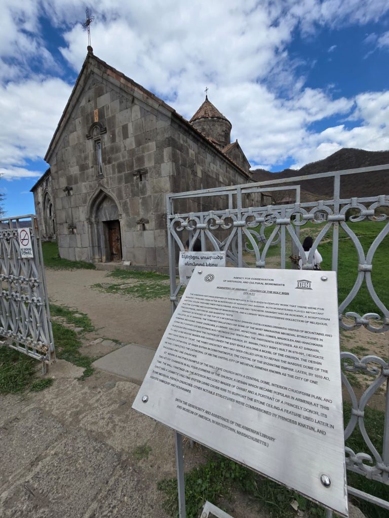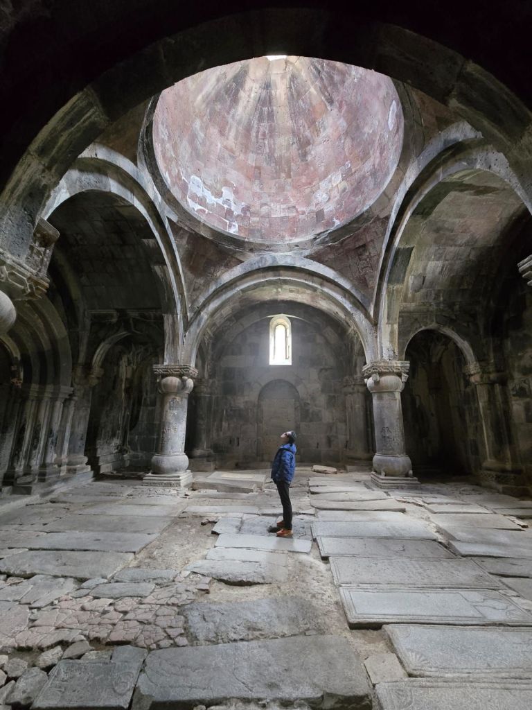 Tak jauh dari situ, kami melanjutkan perjalanan ke Sanahin Monastery, biara “kembaran” dari Haghbat yang juga kaya sejarah. Dalam bahasa Armenia, Sanahin berarti “lebih tua”, merujuk pada sejarah gereja ini lebih dahulu dibangun dari gereja Haghbat. Lorong-lorong batunya terasa sunyi dan mistis. Di dalamnya, cahaya masuk dari celah-celah dinding dan atap, menciptakan atmosfer yang sangat khas biara-biara kuno Armenia.