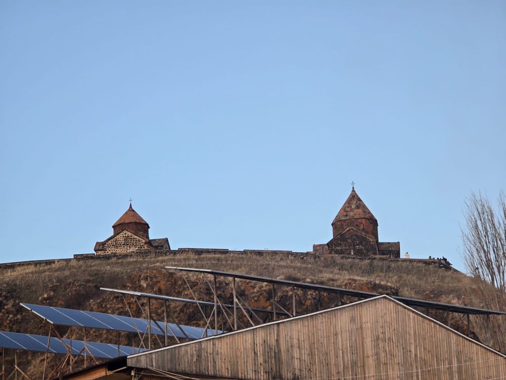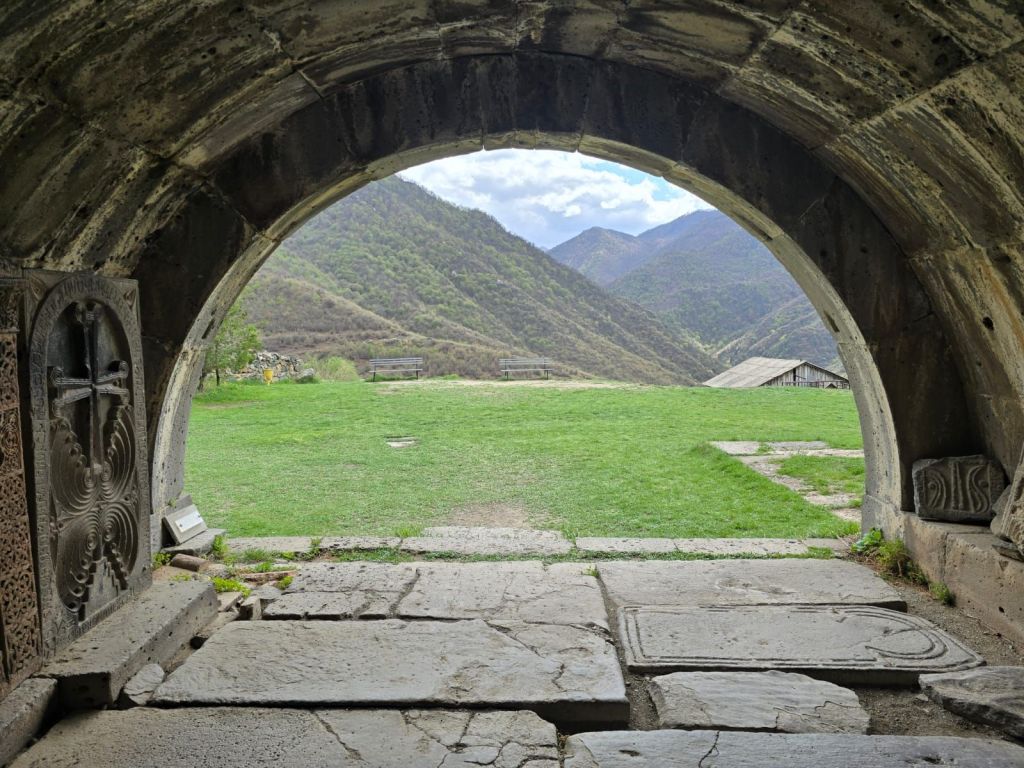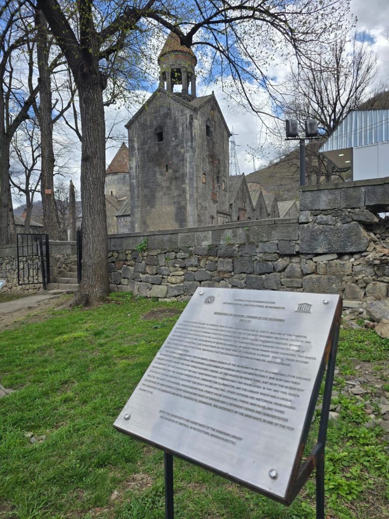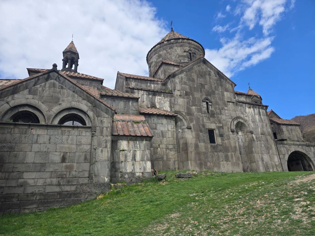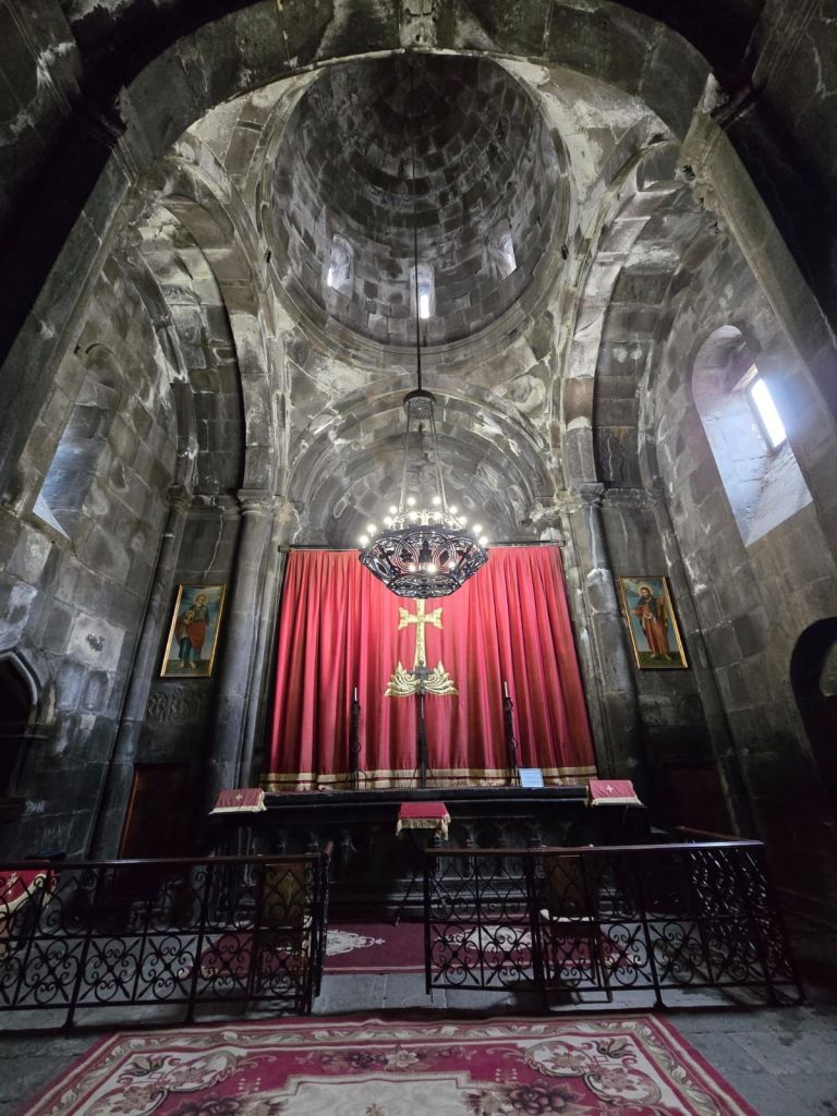 Tak jauh dari situ, kami melanjutkan perjalanan ke Sanahin Monastery, biara “kembaran” dari Haghbat yang juga kaya sejarah. Dalam bahasa Armenia, Sanahin berarti “lebih tua”, merujuk pada sejarah gereja ini lebih dahulu dibangun dari gereja Haghbat. Lorong-lorong batunya terasa sunyi dan mistis. Di dalamnya, cahaya masuk dari celah-celah dinding dan atap, menciptakan atmosfer yang sangat khas biara-biara kuno Armenia.